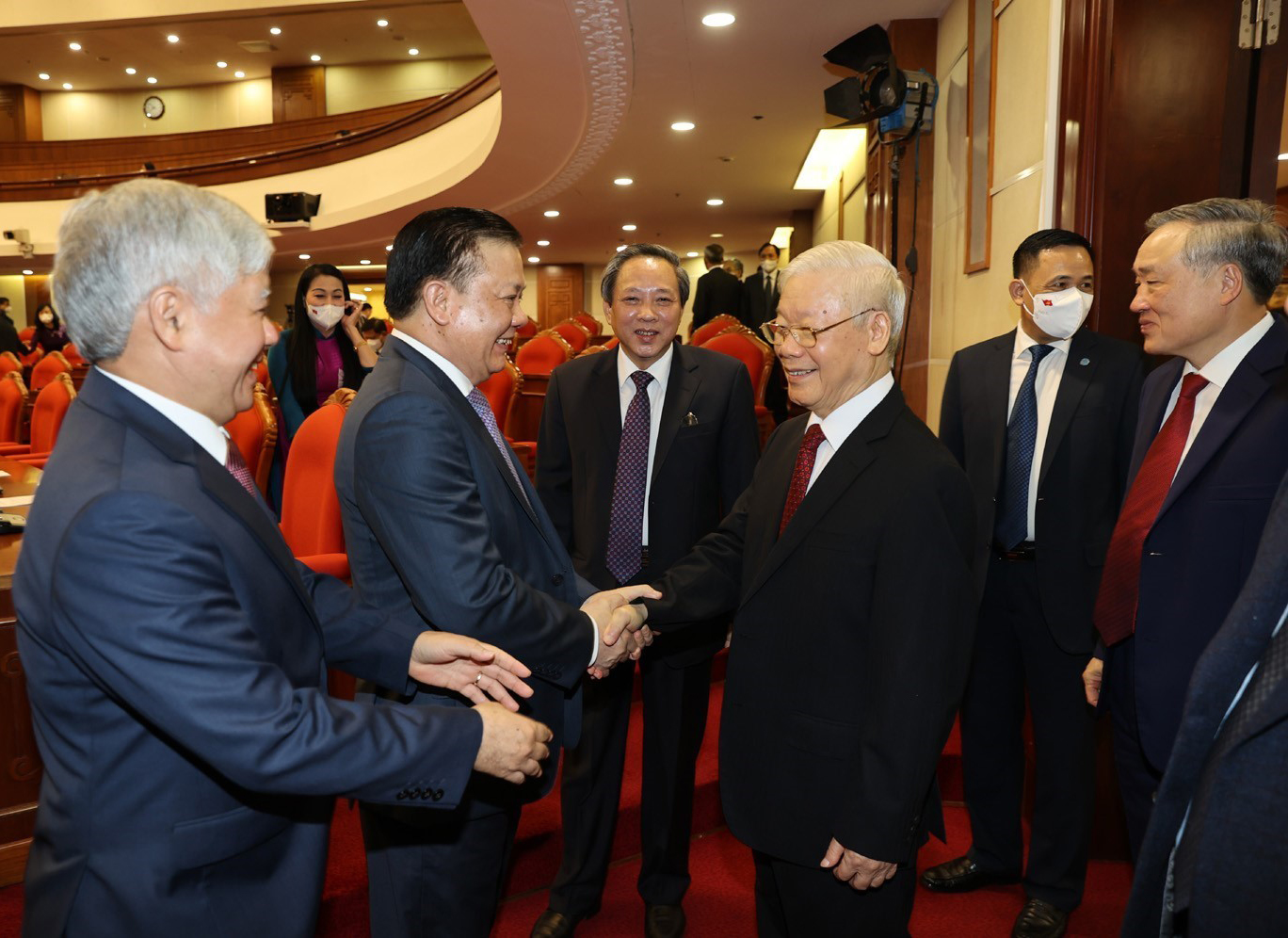 Tổng Bí thư Nguyễn Phú Trọng cùng các đồng chí lãnh đạo Đảng, Nhà nước và các đại biểu dự Hội nghị lần thứ ba Ban Chấp hành Trung ương Đảng khóa XIII_Ảnh: TTXVN