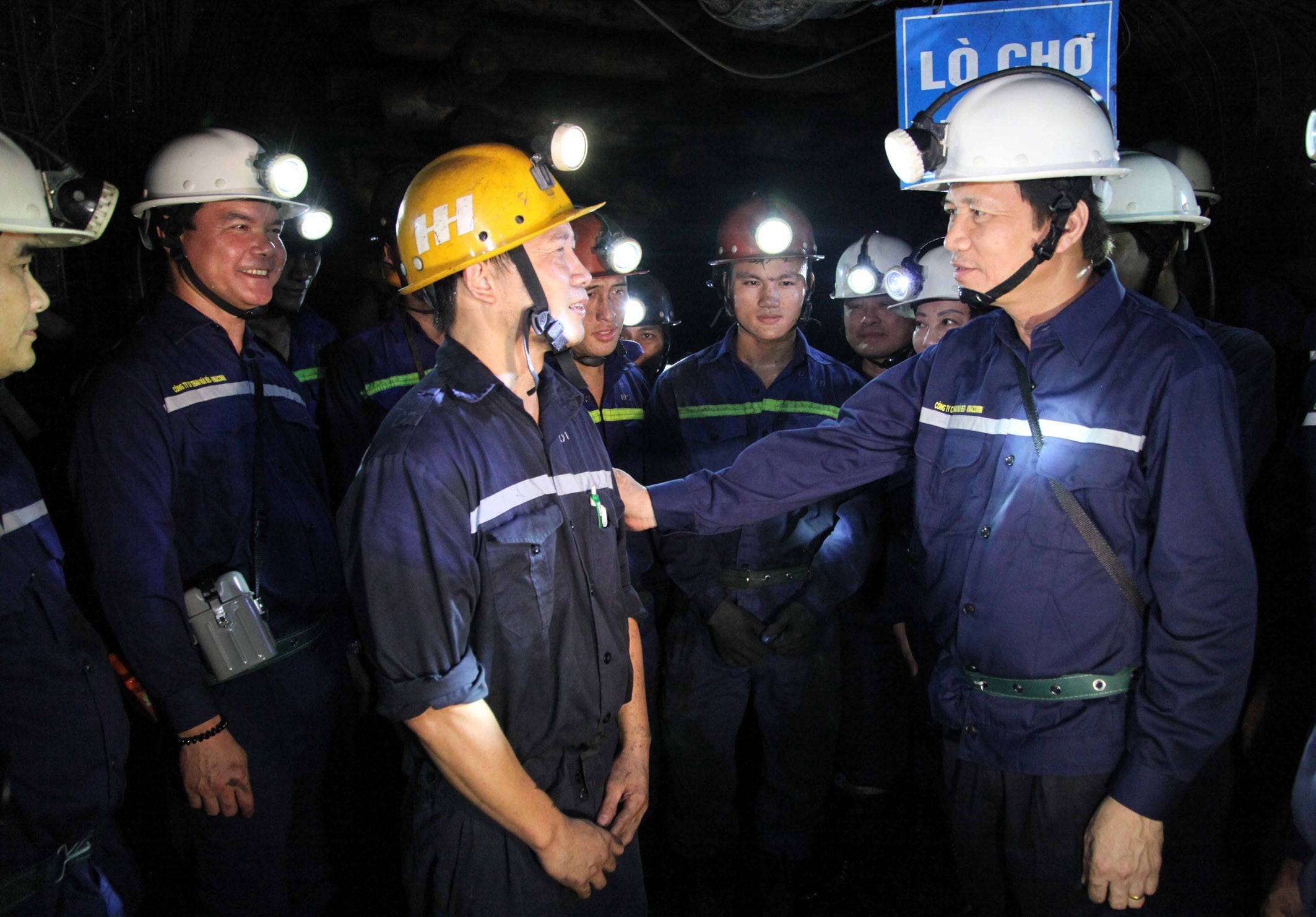 Các đồng chí Ủy viên Trung ương Đảng: Bộ trưởng Bộ Lao động - Thương binh và Xã hội Đào Ngọc Dung và Chủ tịch Tổng Liên đoàn Lao động Việt Nam Nguyễn Đình Khang thăm hỏi công nhân mỏ than hầm lò của Công ty cổ phần Than Núi Béo_Ảnh: TTXVN