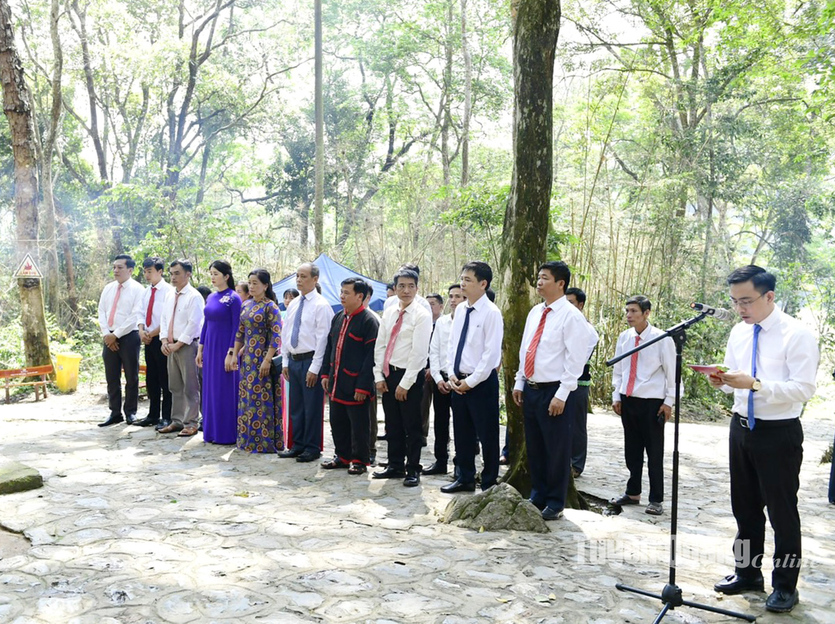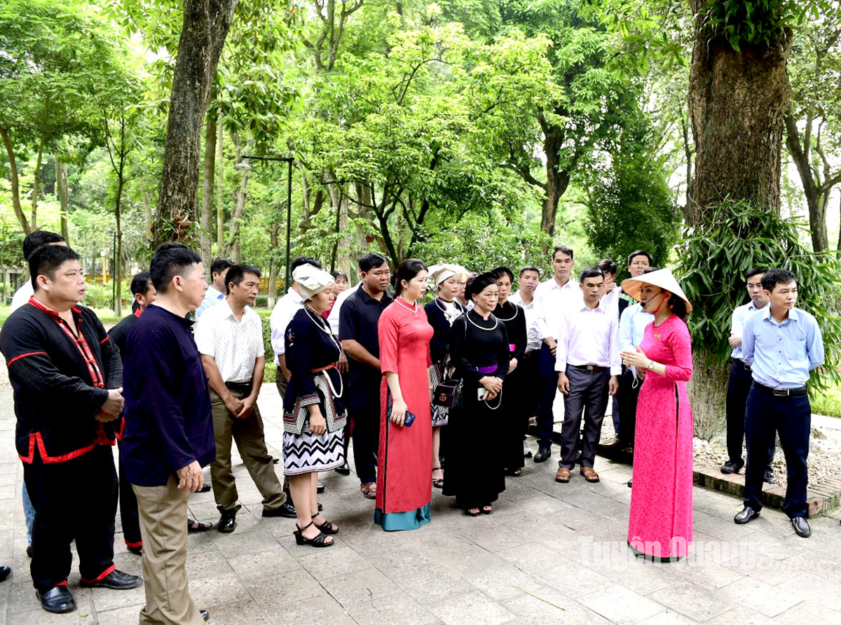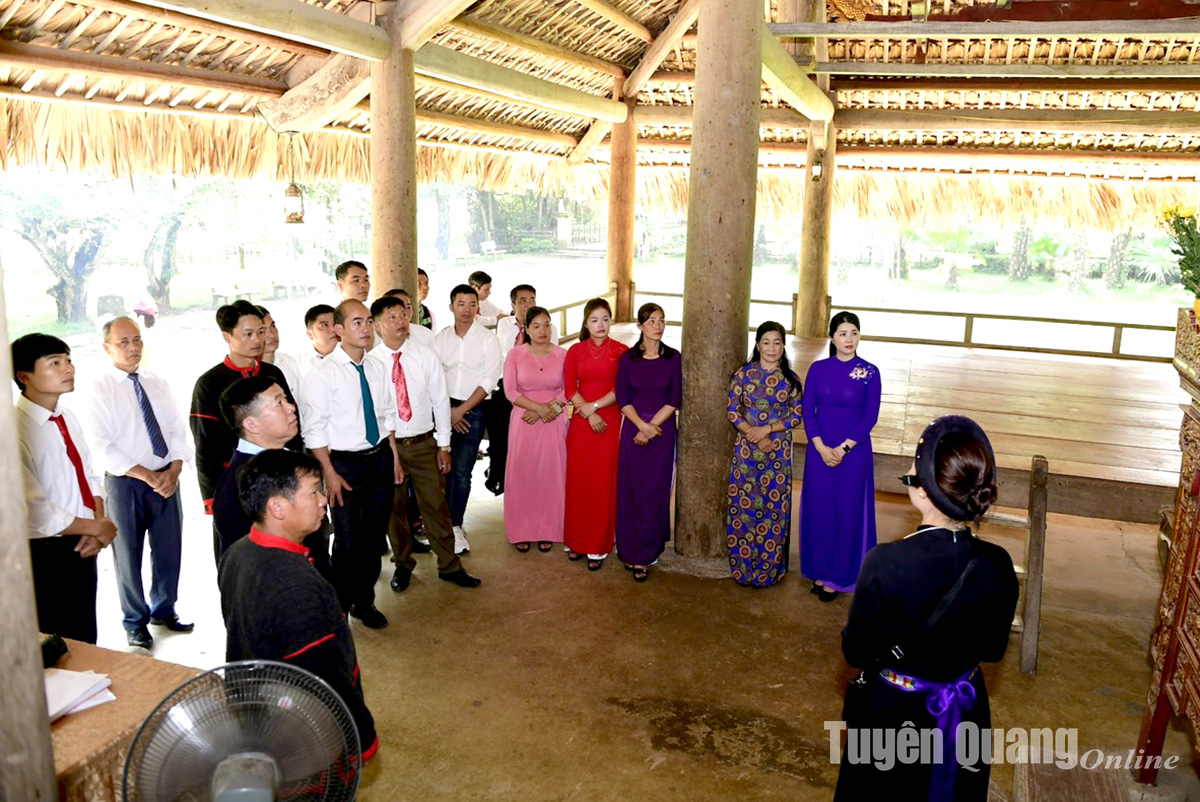 Đoàn cán bộ, đảng viên, công chức, viên chức, người lao động Văn phòng Tỉnh ủy, xã Linh Phú (Chiêm Hóa) nghe thuyết minh về di tích Đình Tân Trào. Ảnh: Quốc Việt