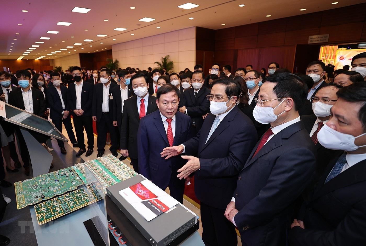 Ủy viên Bộ Chính trị, Thủ tướng Chính phủ Phạm Minh Chính tham quan các sản phẩm công nghệ trưng bày tại Diễn đàn quốc gia Phát triển doanh nghiệp công nghệ số lần thứ 3 - năm 2021_Ảnh: TTXVN