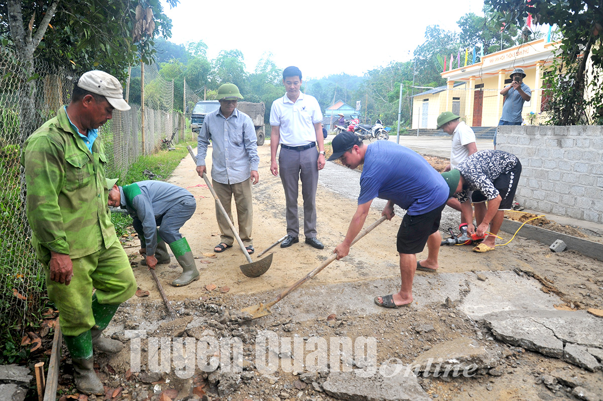 Đồng chí Vũ Văn Sỹ (người đứng hàng sau, bên phải) Chủ tịch UBND xã Yên Phú (Hàm Yên) đi cơ sở, nắm tình hình làm đường bê tông nông thôn.