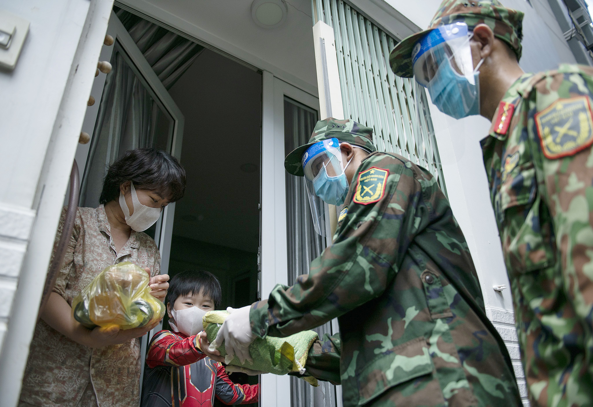 Lực lượng quân đội trao thực phẩm hỗ trợ cho người dân tại Thành phố Hồ Chí Minh phòng, chống dịch COVID-19_Ảnh: zing.vn