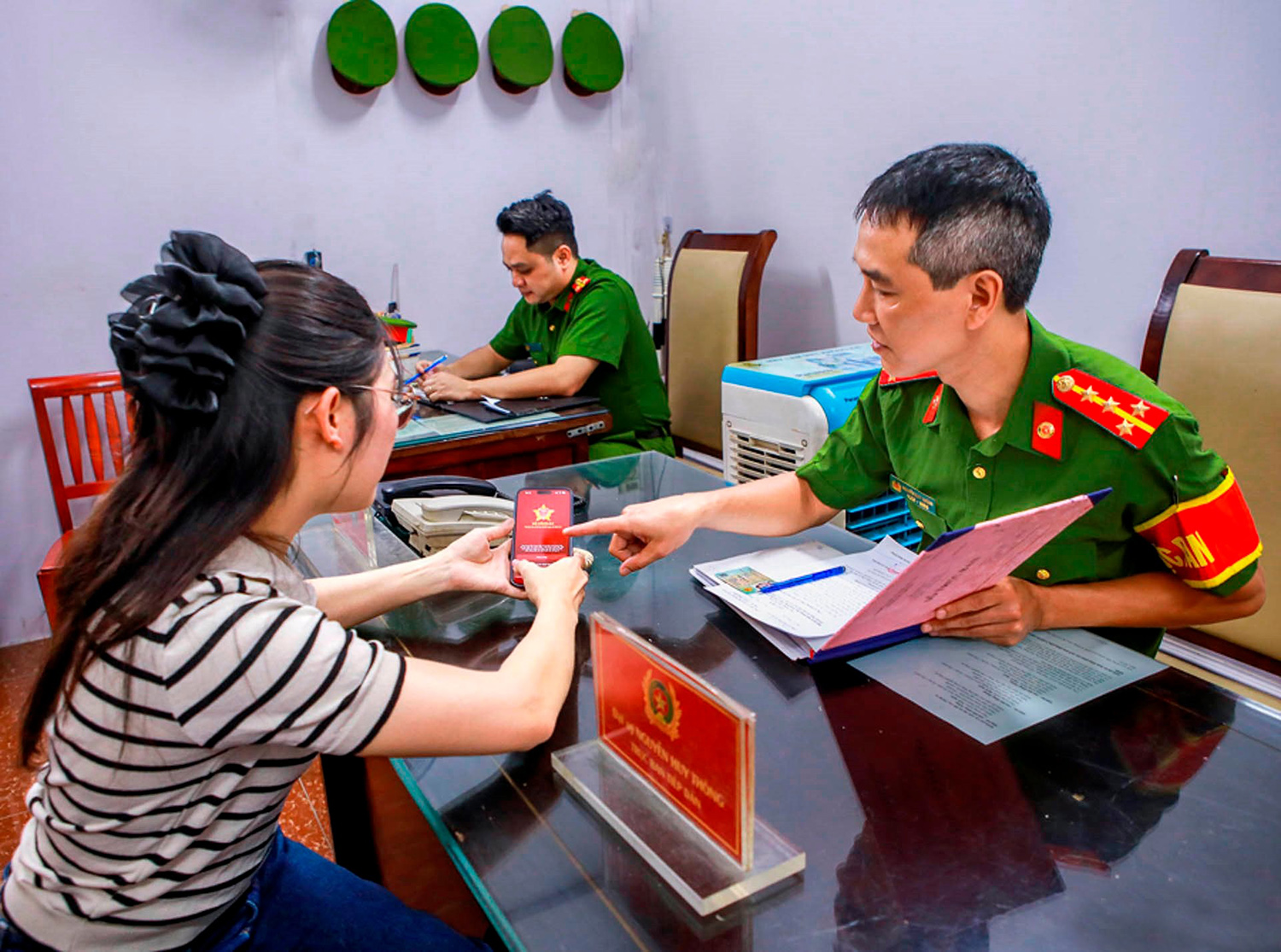 Cán bộ, chiến sĩ công an nhân dân hướng dẫn người dân cài đặt VNeID _Nguồn: nhiepanhdoisong.vn