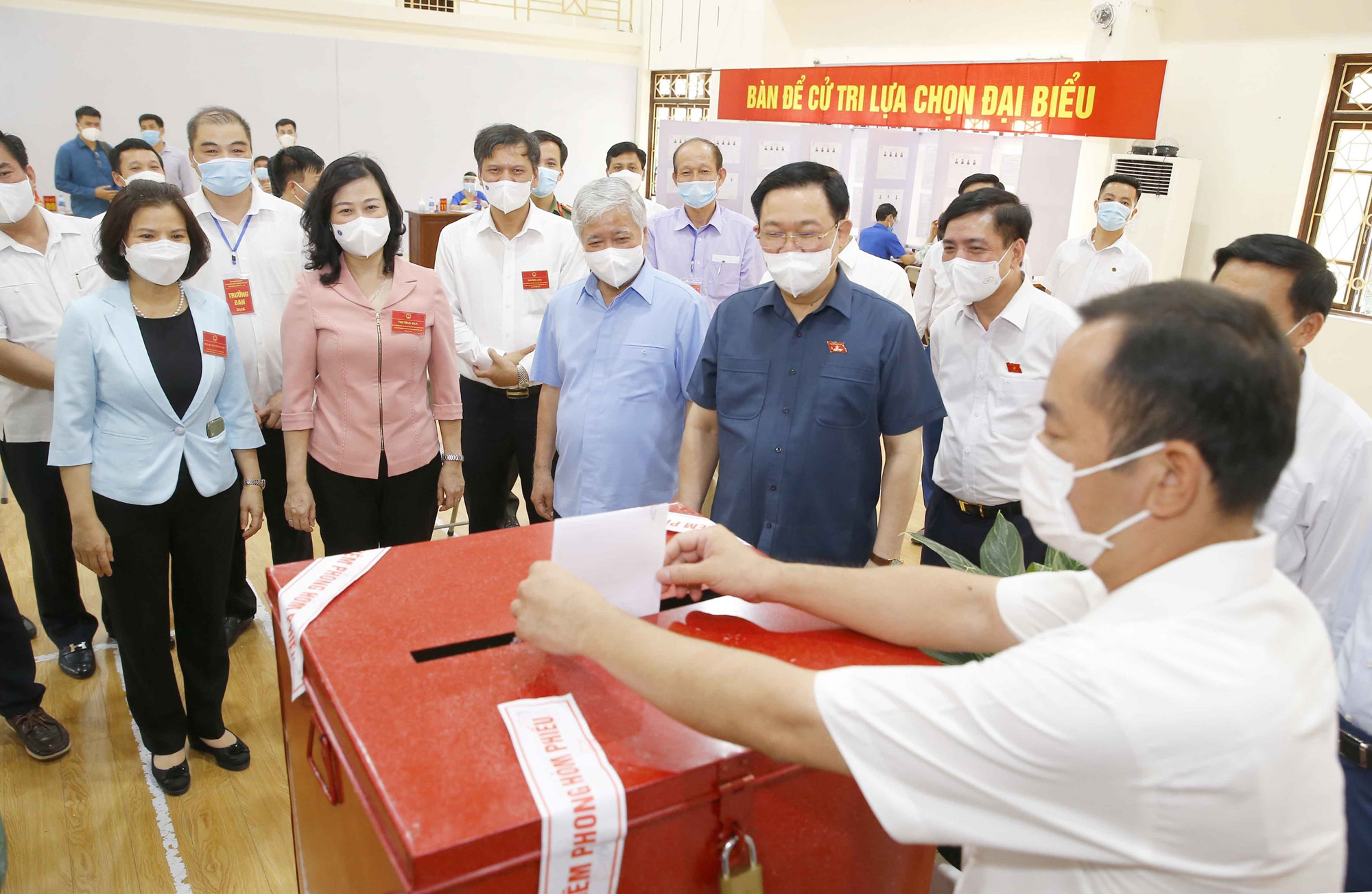 Đồng chí Vương Đình Huệ, Ủy viên Bộ Chính trị, Chủ tịch Quốc hội, Chủ tịch Hội đồng Bầu cử quốc gia với các cử tri đi bầu cử đại biểu Quốc hội khóa XV và đại biểu hội đồng nhân dân các cấp nhiệm kỳ 2021 - 2026 tại tỉnh Bắc Ninh_Ảnh: TTXVN