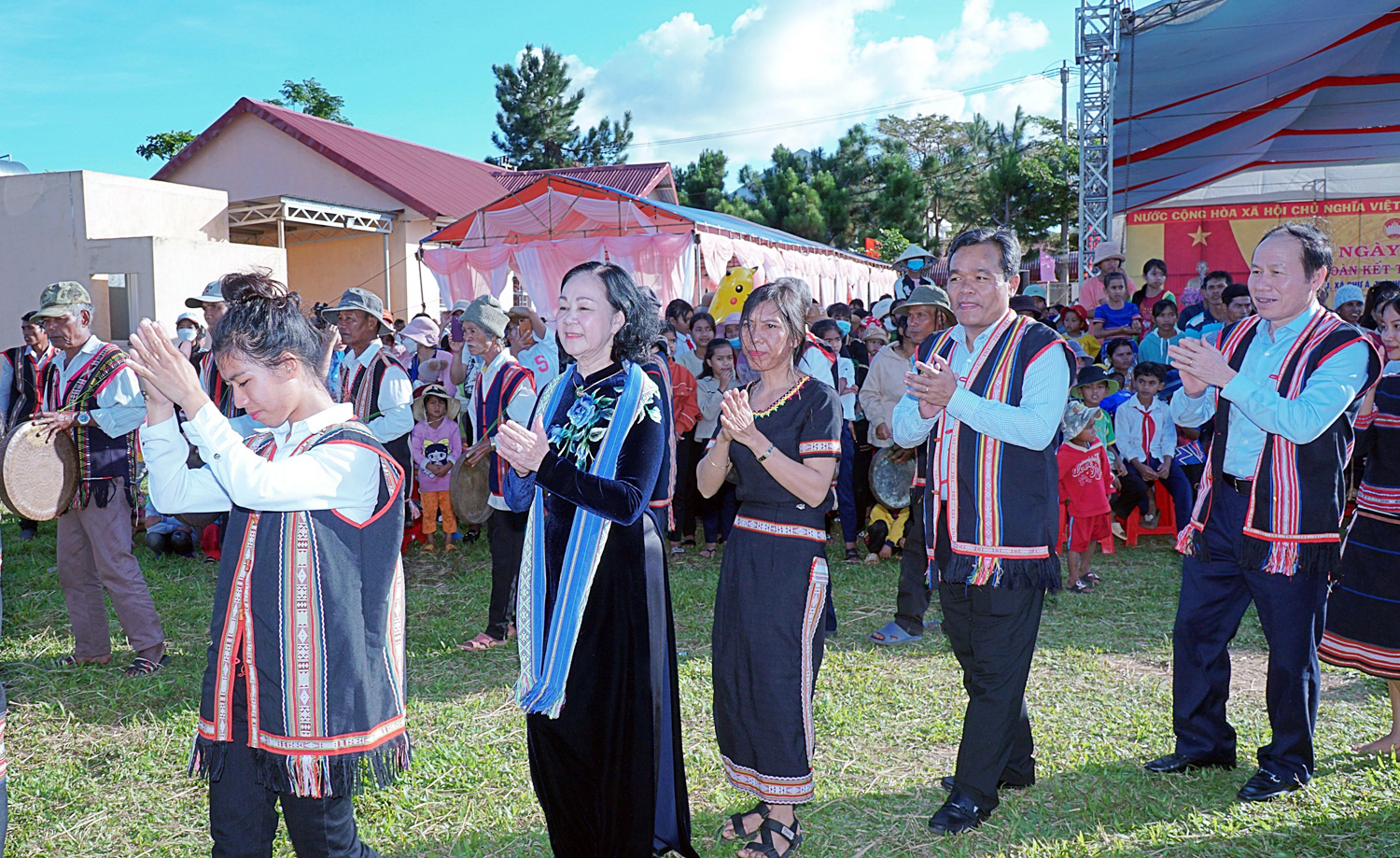 Đồng chí Trương Thị Mai, Ủy viên Bộ Chính trị, Bí thư Trung ương Đảng, Trưởng Ban Tổ chức Trung ương dự Ngày hội Đại đoàn kết toàn dân tộc với đồng bào Ba-na tại làng Wâu, xã Chư Á, thành phố Pleiku, tỉnh Gia Lai_Ảnh: TTXVN