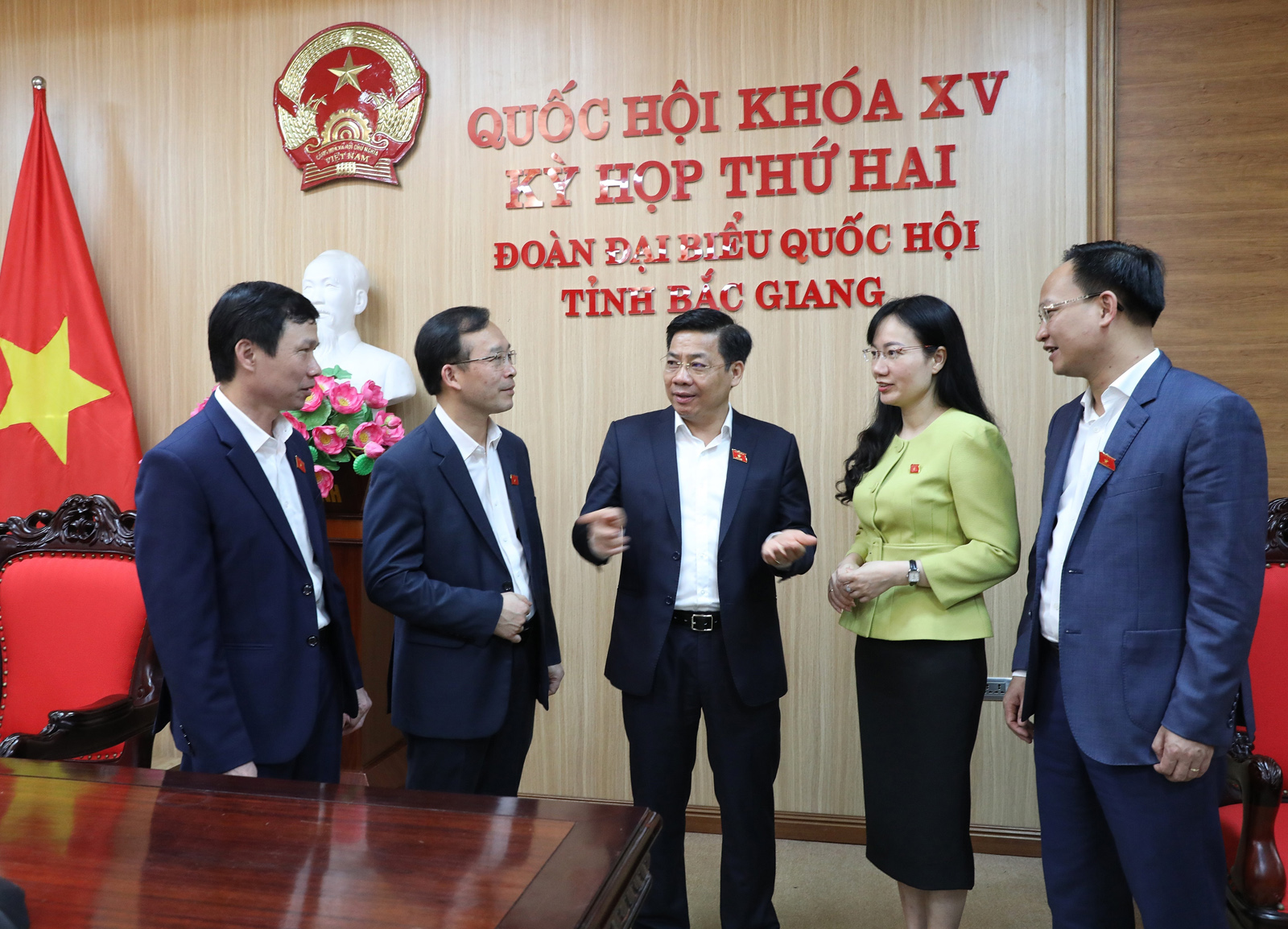 Đồng chí Dương Văn Thái, Ủy viên Trung ương Đảng, Bí thư Tỉnh ủy, Trưởng Đoàn đại biểu Quốc hội tỉnh Bắc Giang cùng các đại biểu thảo luận bên lề cuộc họp trực tuyến về dự án Luật Kinh doanh bảo hiểm (sửa đổi)_Ảnh: TTXVN