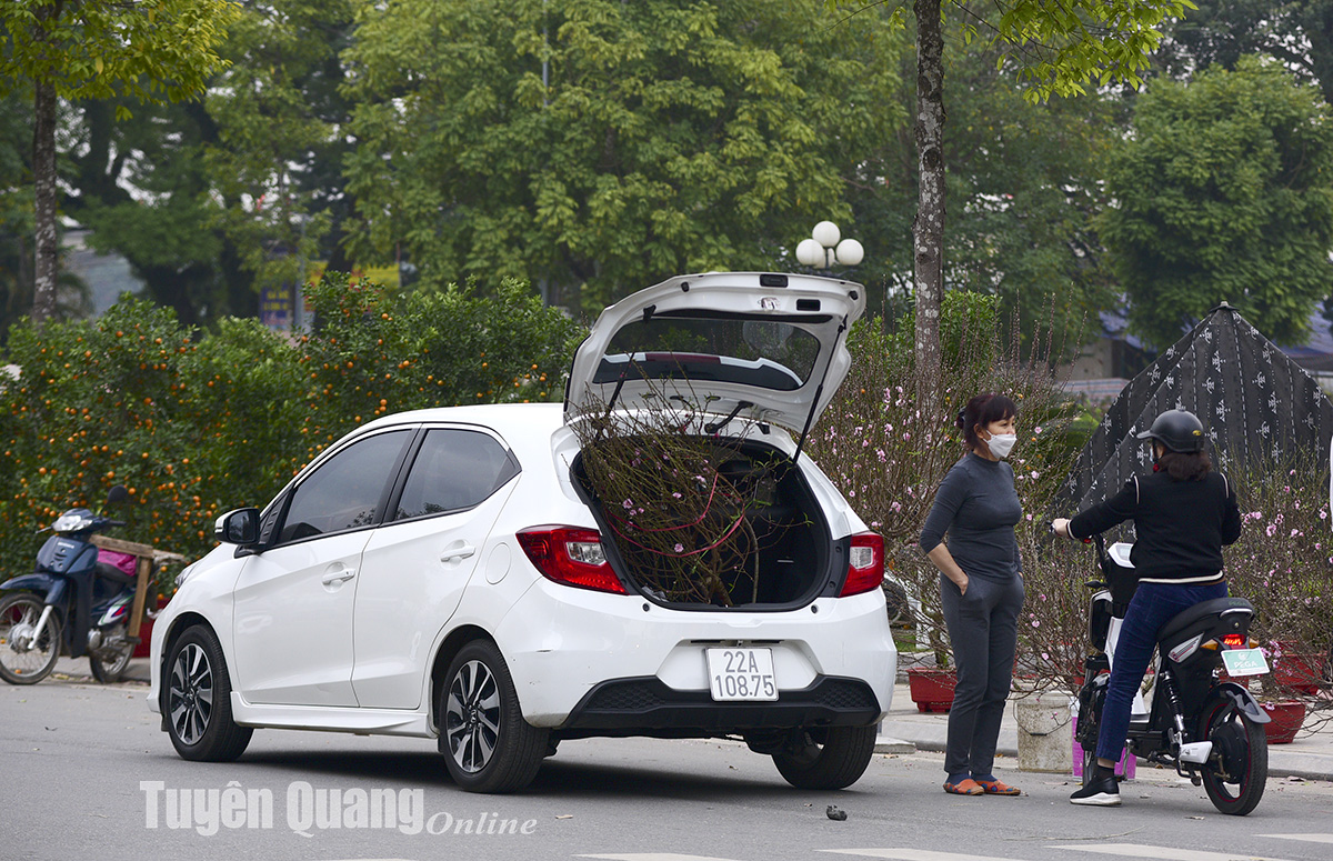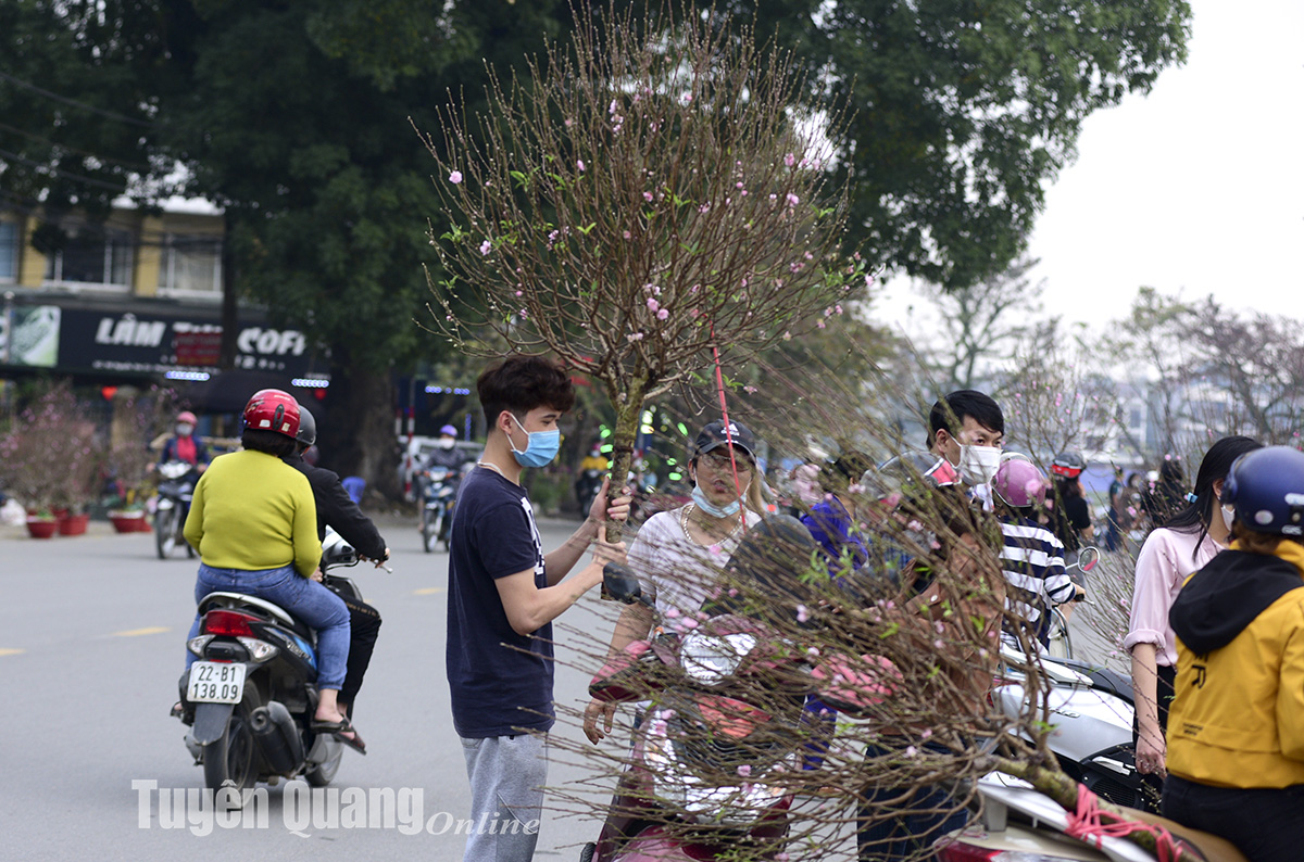 Chợ hoa đào rộn ràng sắc xuân tại khu vực tuyến đường qua Quảng trường Nguyễn Tất Thành, TP Tuyên Quang.