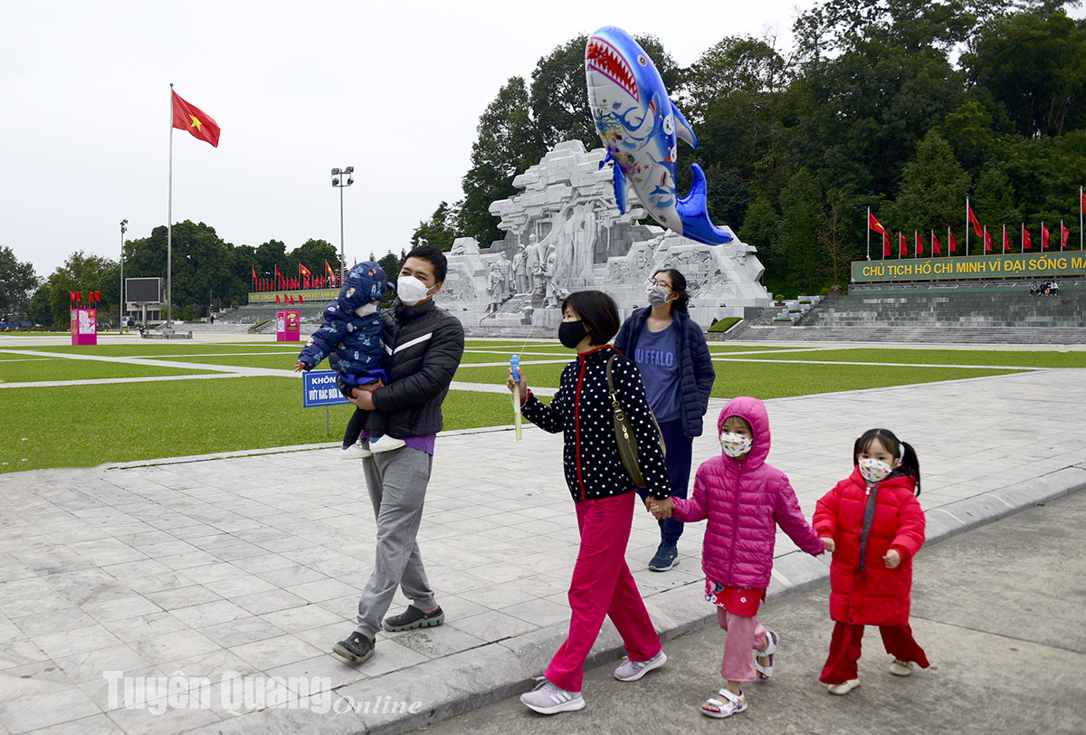 Một gia đình đi chơi Tết trên Quảng trường Nguyễn Tất Thành, TP Tuyên Quang.