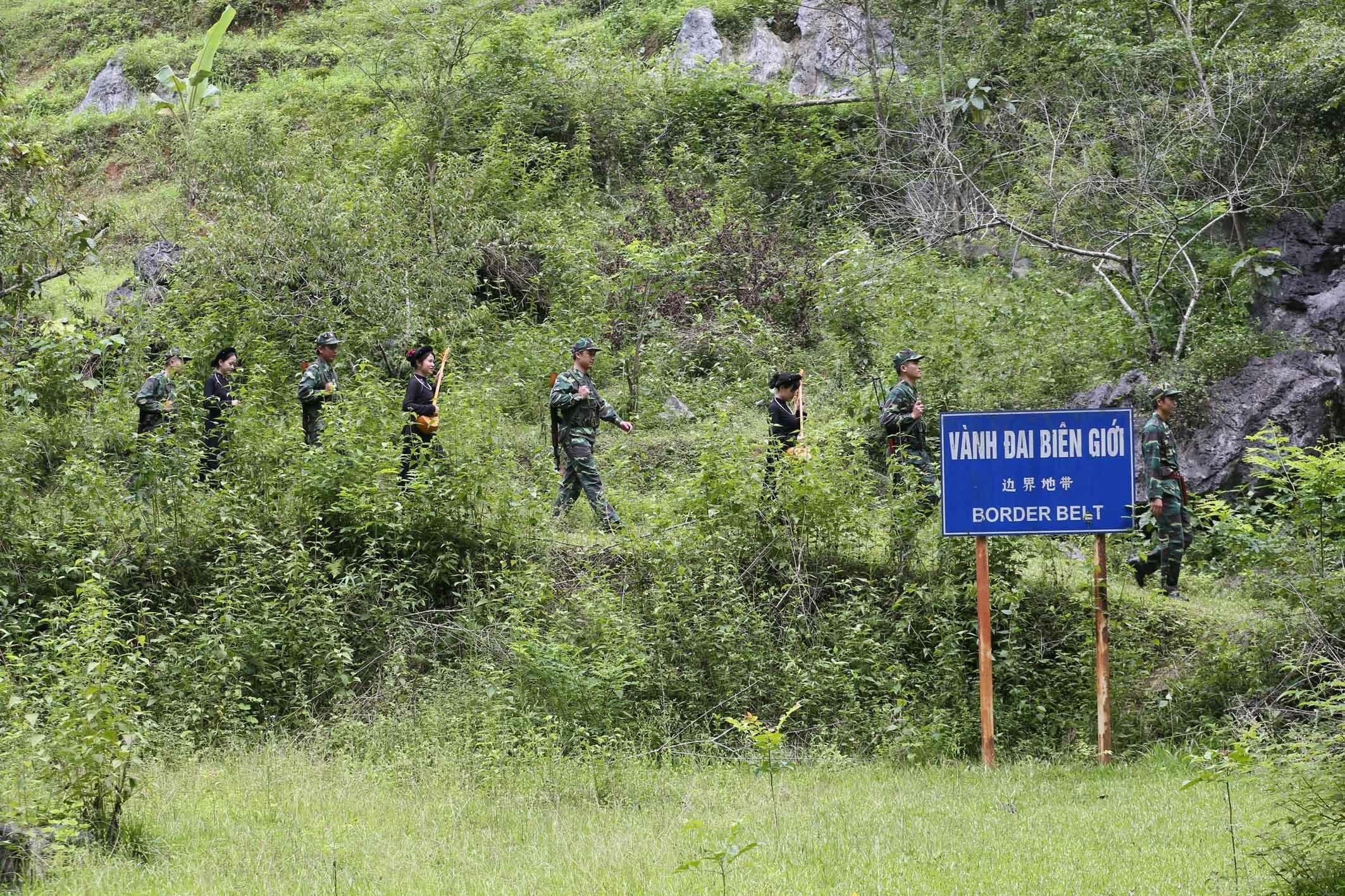 Chiến sĩ Ðồn Biên phòng Sóc Giang (huyện Pắc Bó, tỉnh Cao Bằng) tuần tra biên giới với đồng bào các dân tộc