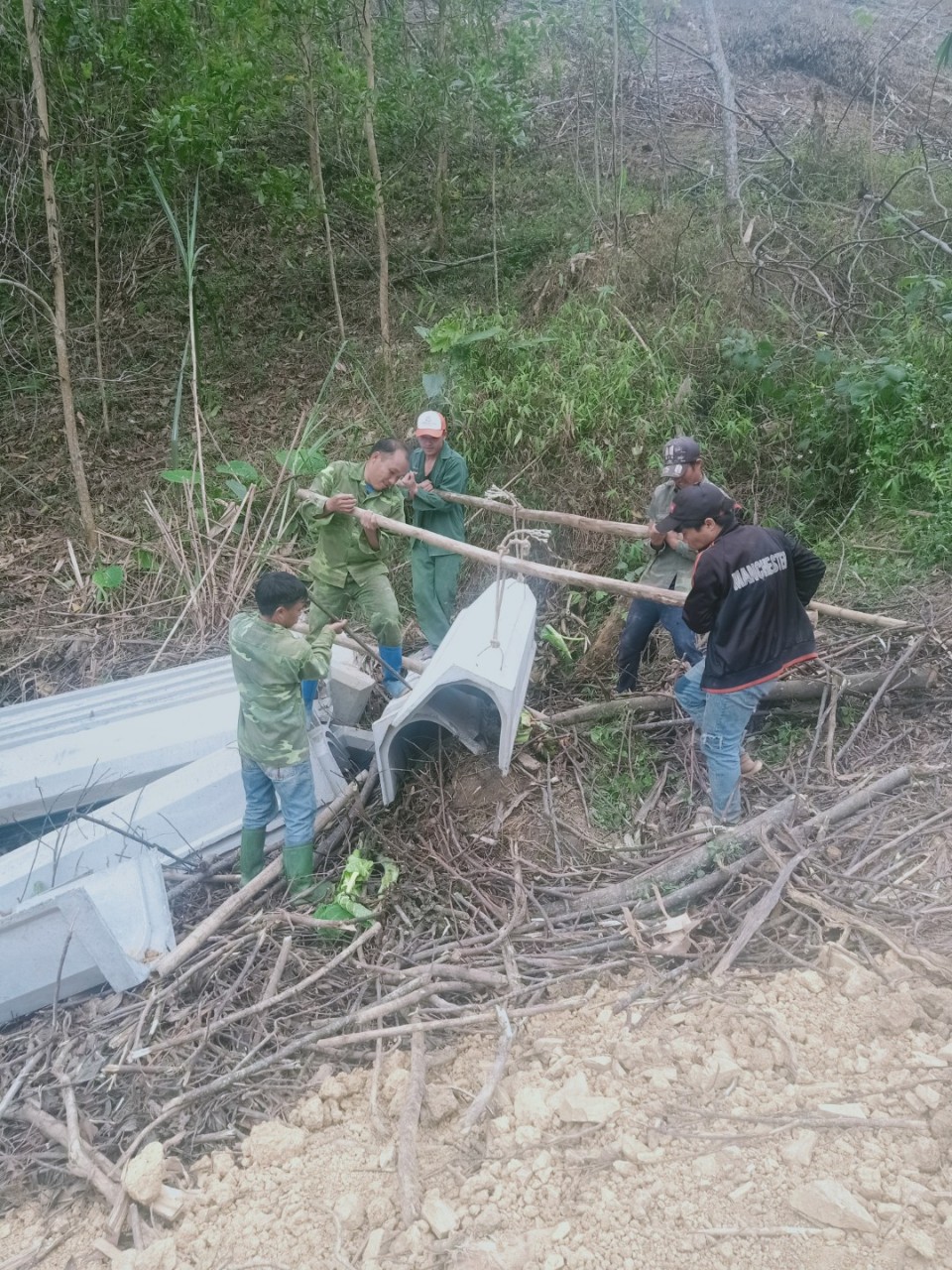 Nhân dân Thôn Kim Thu Ngà tham gia lắp đặt cấu kiện kênh mương bằng bê tông đúc sẵn