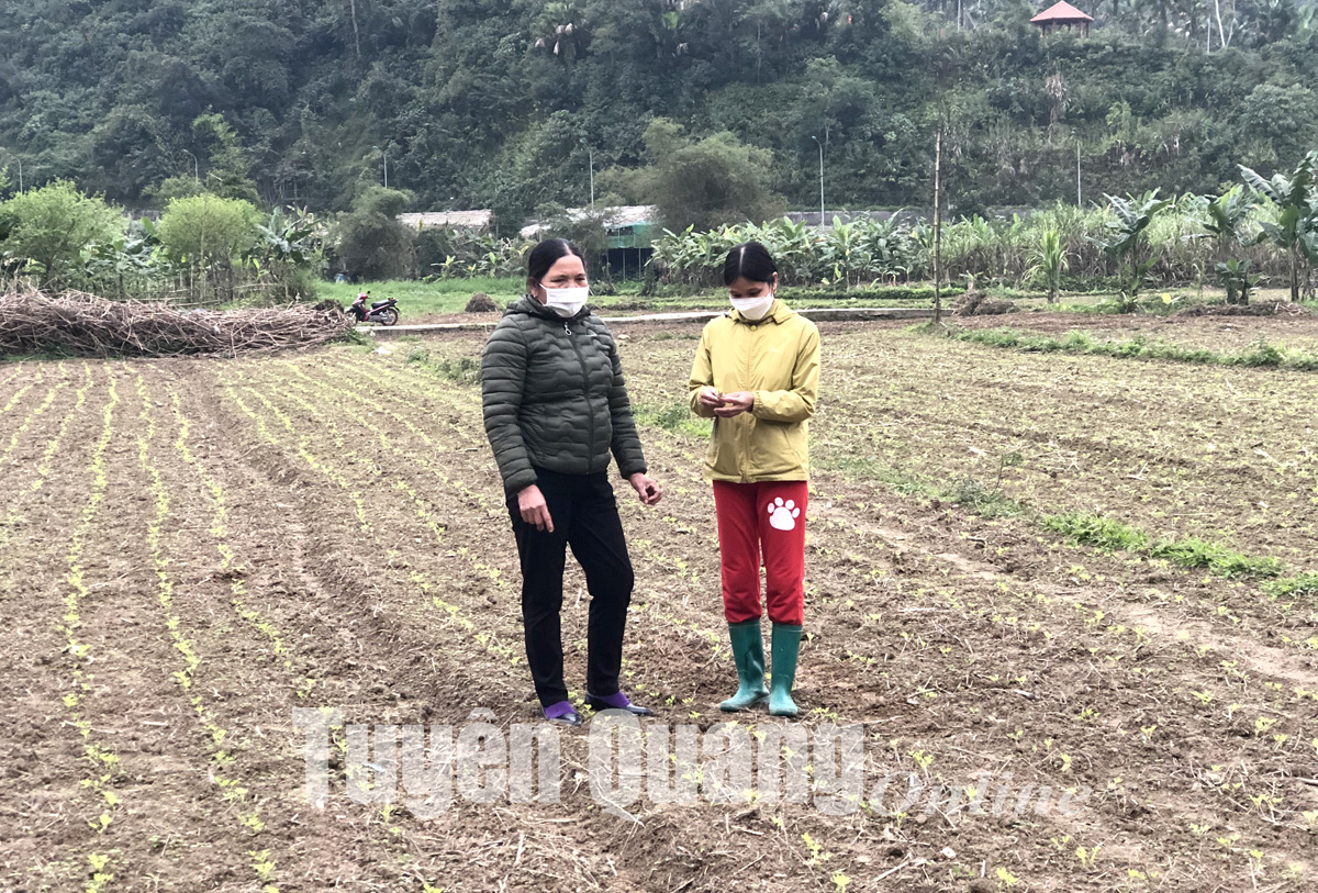 Đồng chí Nguyễn Thị Bích (bên trái), Bí thư chi bộ tổ dân phố Nà Khà, thị trấn Lăng Can (Lâm Bình) thăm vườn lạc