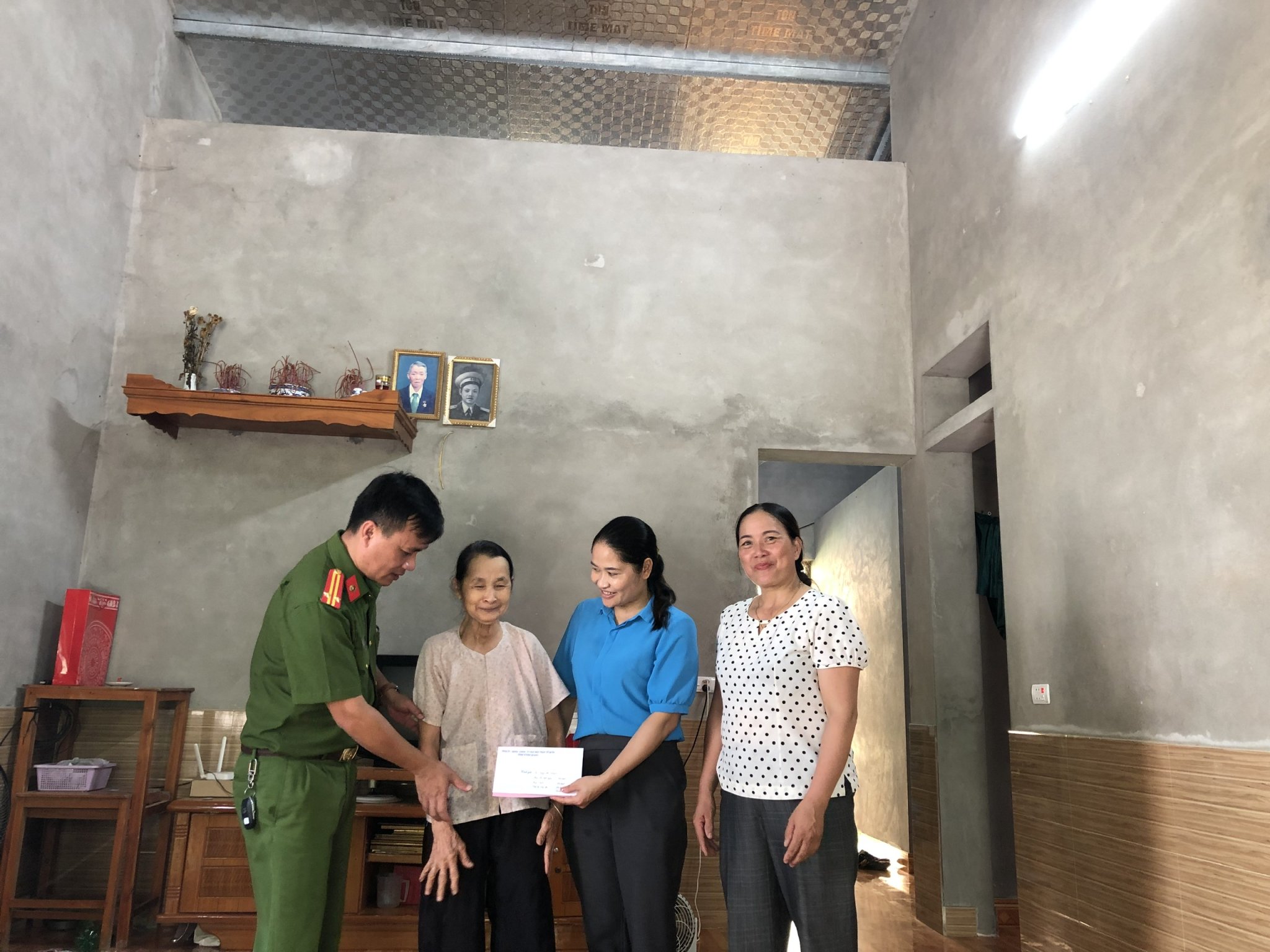 Đồng chí Chủ tịch MTTQ xã Thái Bình (thứ hai từ phải sang) thăm hỏi, tặng quà hộ gia đình thờ cúng liệt sỹ