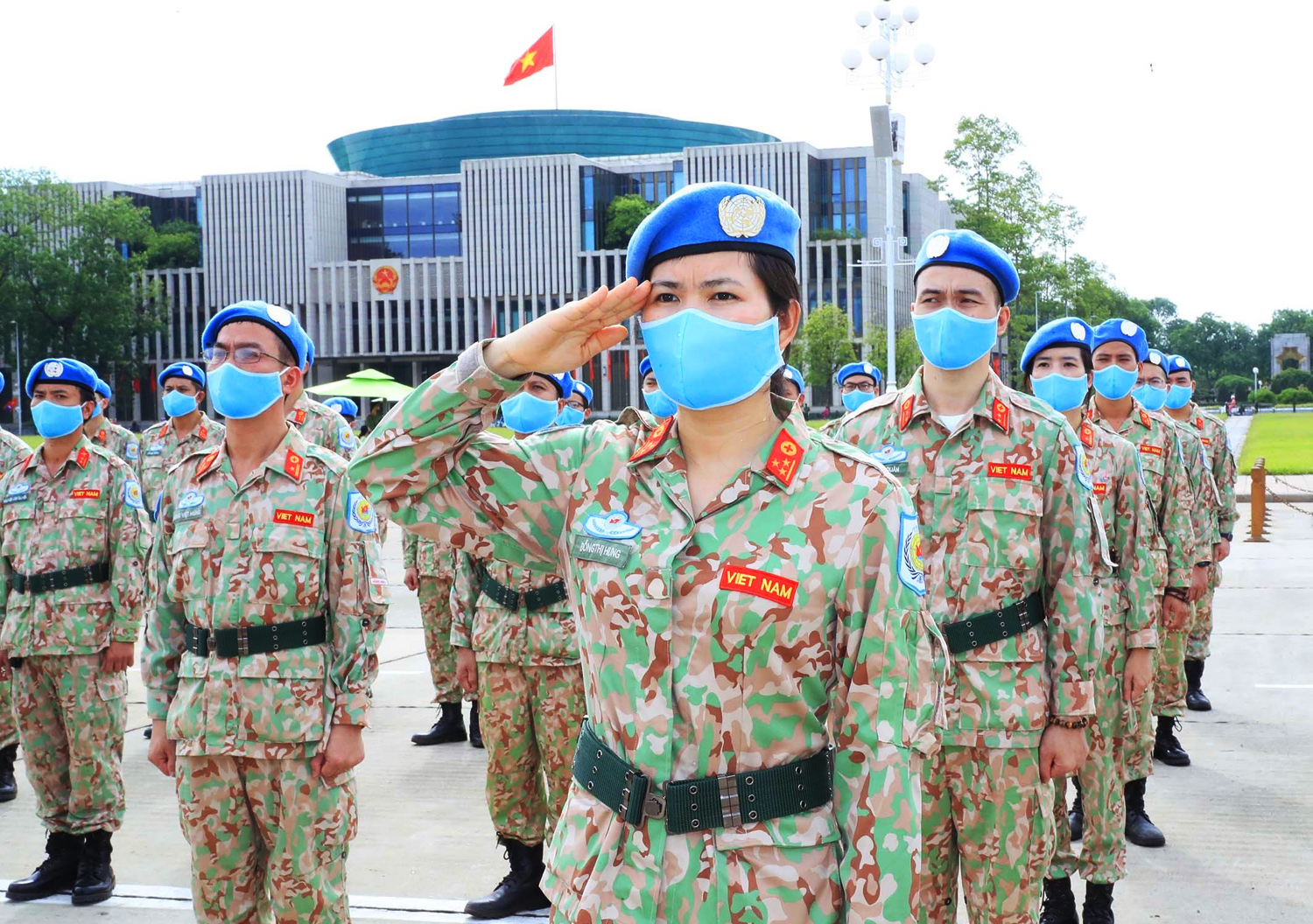 Các sĩ quan của Bệnh viện dã chiến cấp 2 số 2 và làm nhiệm vụ gìn giữ hòa bình Liên hợp quốc tại Phái bộ Nam Sudan và Cộng hòa Trung Phi nhiệm kỳ 2020 - 2021 báo công dâng Bác_Ảnh: TTXVN