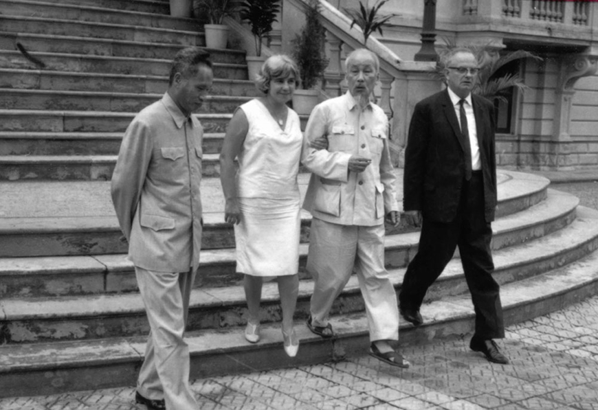 Chủ tịch Hồ Chí Minh tiếp nhà báo Wilfred Burchett tại Phủ Chủ tịch, năm 1966. Ảnh: Bảo tàng Báo chí Việt Nam