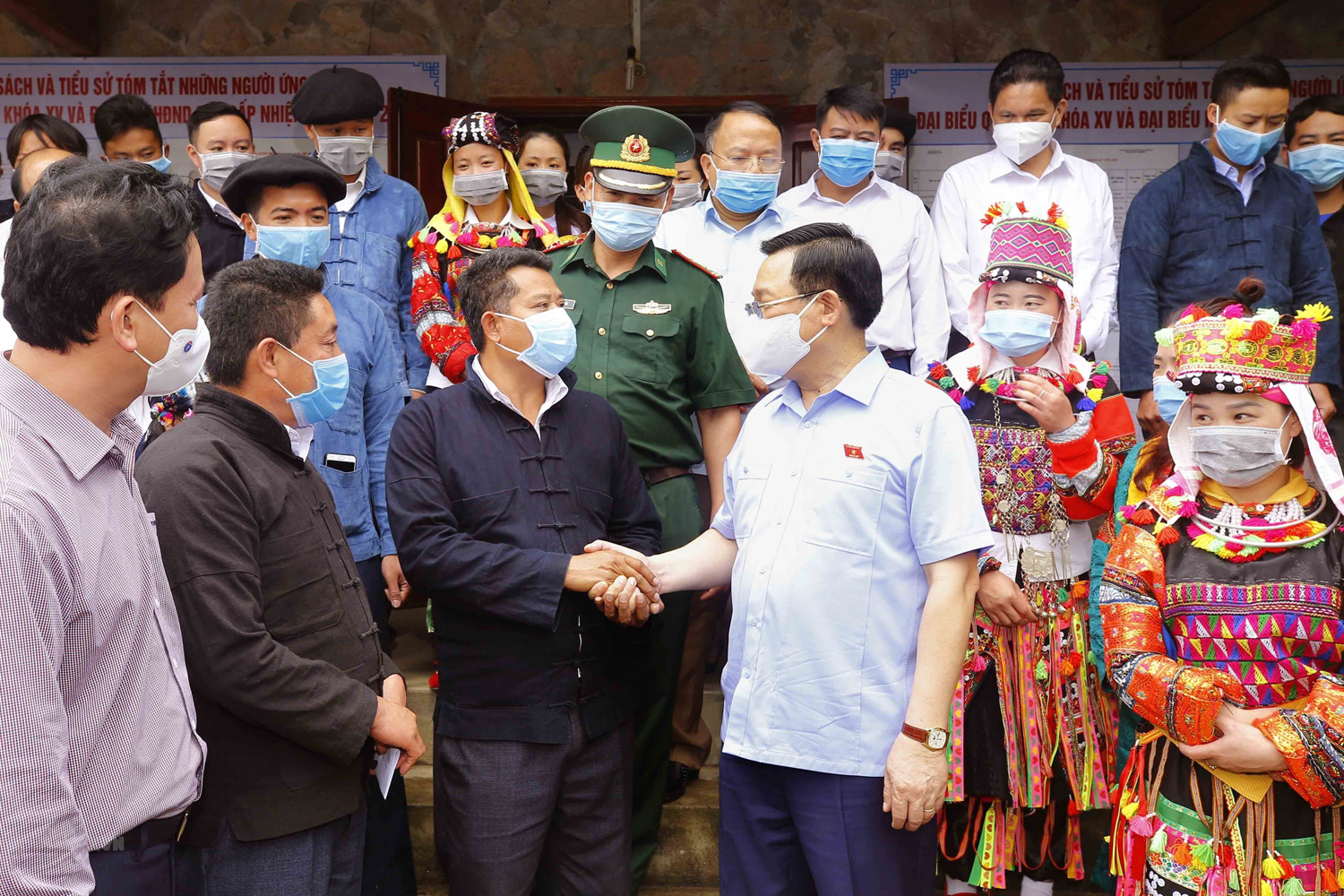 Ủy viên Bộ Chính trị, Chủ tịch Quốc hội Vương Đình Huệ với cử tri các thôn: Lô Lô Chải, Séo Lủng, xã Lũng Cú, huyện Đồng Văn, tỉnh Hà Giang_Ảnh: TTXVN