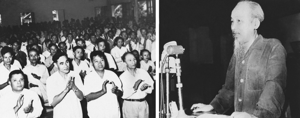 Chủ tịch Hồ Chí Minh thăm Hội nghị phổ biến nghị quyết của Bộ Chính trị về cuộc vận động "Nâng cao ý thức trách nhiệm, tăng cường quản lý kinh tế tài chính, cải tiến kỹ thuật, chống tham ô, lãng phí, quan liêu" (Cuộc vận động "Ba xây, ba chống"),  năm 1963_Nguồn: hochiminh.vn