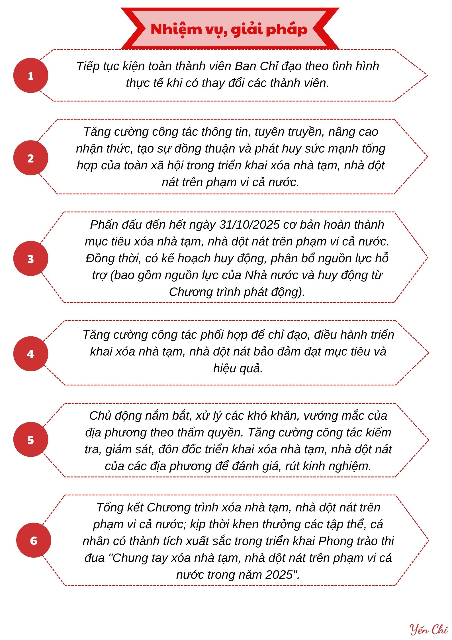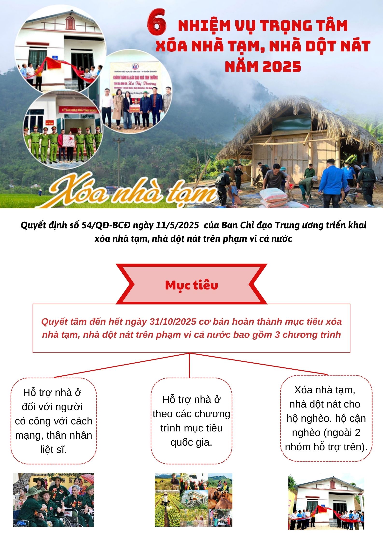 Năm 2025, Ban Chỉ đạo Trung ương triển khai xóa nhà tạm, nhà dột nát trên phạm vi cả nước sẽ tập trung thực hiện 6 nhiệm vụ trọng tâm, quyết tâm đến hết ngày 31/10/2025 cơ bản hoàn thành mục tiêu xóa nhà tạm, nhà dột nát trên phạm vi cả nước.
