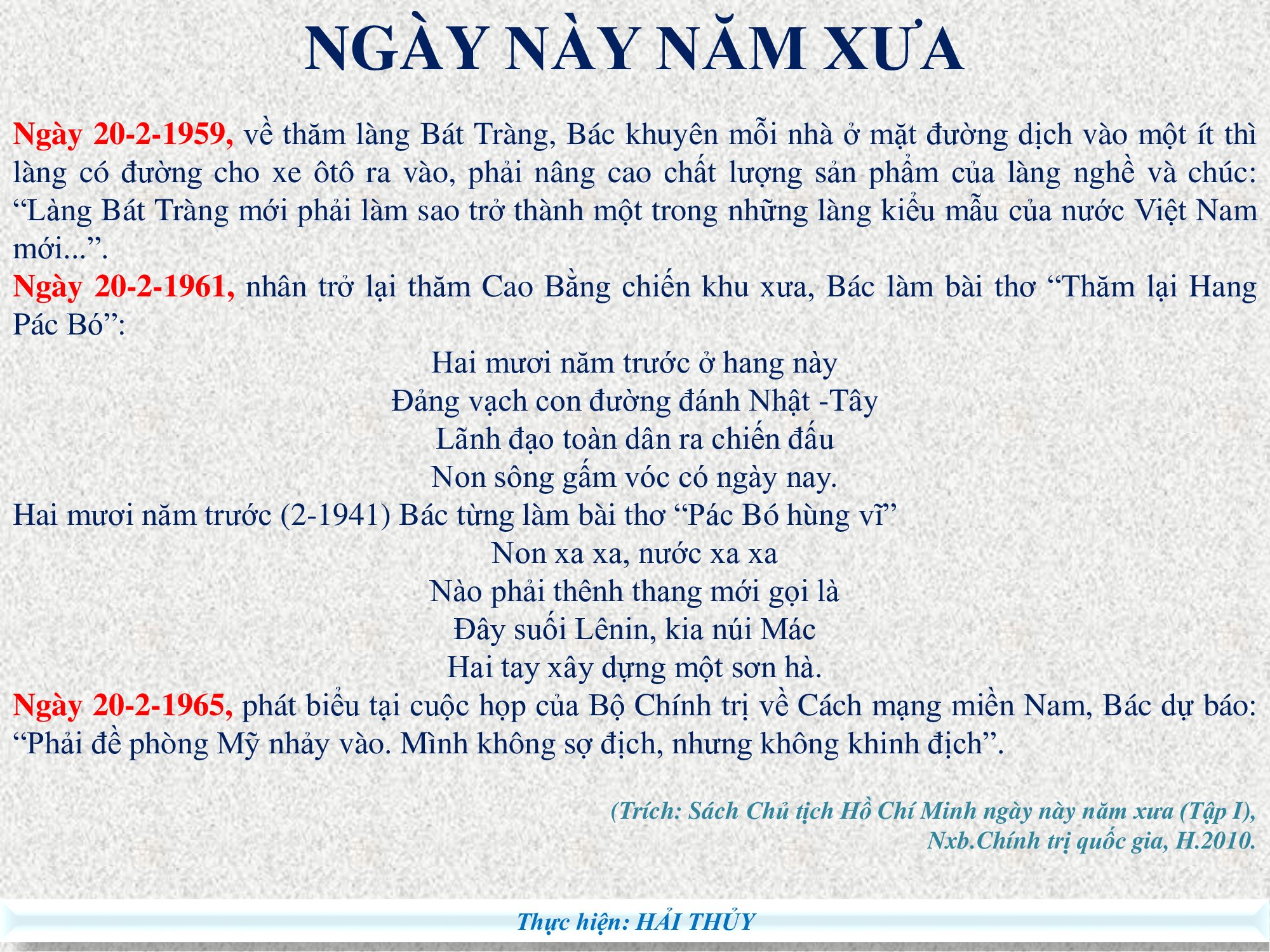 Sinh thời, Chủ tịch Hồ Chí Minh - người sáng lập và rèn luyện Đảng Cộng sản Việt Nam từng nhiều lần khẳng định: “Muôn việc thành công hoặc thất bại, đều do cán bộ tốt hoặc kém”. Ngày 20 tháng 2 năm 1947, trong bài nói chuyện với cán bộ tỉnh Thanh Hóa, Người cho rằng: Cán bộ còn là cầu nối, là dây chuyền của bộ máy, phải thực sự tận tâm, tận lực với công việc, thực sự là tấm gương trước quần chúng nhân dân, thực sự là công bộc của dân. Bác nhấn mạnh: “Cán bộ là cái dây chuyền của bộ máy. Nếu dây chuyền không tốt, không chạy thì động cơ dù tốt, dù chạy toàn bộ máy cũng tê liệt... Đoàn thể mình mạnh hay yếu là ở dân. Dân nghe theo là mình mạnh. Hiểu nguyện vọng của dân, sự cực khổ của dân. Hiểu tâm lý của dân, học sáng kiến của dân... Phải tôn kính dân, phải làm cho dân tin, phải làm gương cho dân. Muốn cho dân phục phải được dân tin, muốn cho dân tin phải thanh khiết...”.