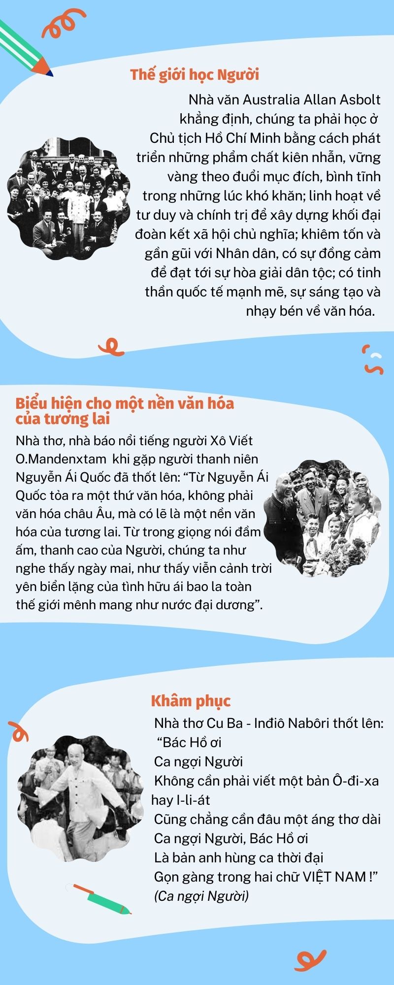 Những ký ức về Chủ tịch Hồ Chí Minh vẫn sống mãi trong lòng mỗi người dân Việt Nam và bạn bè quốc tế với tầm vóc một danh nhân kiệt xuất, lỗi lạc của thời đại, một nhà chính trị tài ba và cũng là tấm gương cao đẹp tỏa sáng chủ nghĩa nhân văn, kết tinh những tư tưởng, tình cảm, ước mơ lớn lao của nhân loại.