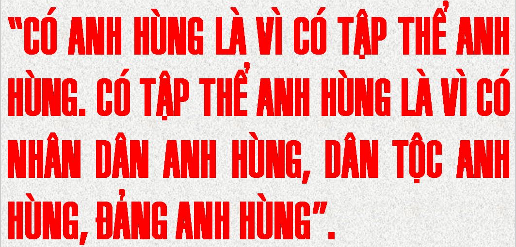Người khẳng định: "Các cô, các chú được tuyên dương là anh hùng phải nhận rõ rằng vinh dự đó là vinh dự chung của tập thể, chứ không chỉ là của riêng từng người. Nếu không có Đảng, không có nhân dân, không có tập thể thì mọi người không trở thành anh hùng được. Có anh hùng là vì có tập thể anh hùng. Có tập thể anh hùng là vì có nhân dân anh hùng, dân tộc anh hùng, Đảng anh hùng. Sự nghiệp anh hùng của nhân dân ta gắn liền với sự nghiệp đấu tranh cách mạng của nhân dân thế giới. Vì vậy, các anh hùng và các đơn vị anh hùng phải luôn luôn khiêm tốn, không được kiêu ngạo". (Hồ Chí Minh, Toàn tập, Nhà xuất bản Chính trị quốc gia - Sự thật, Hà Nội  2011, t.15, tr.263).