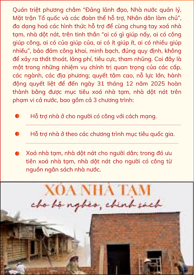 Ngày 06/10/2024, Thủ tướng Chính phủ ban hành Công điện số 102/2024/CĐ-TTg về đẩy mạnh triển khai xoá nhà tạm, nhà dột nát trên phạm vi cả nước, với một số nhiệm vụ sau: