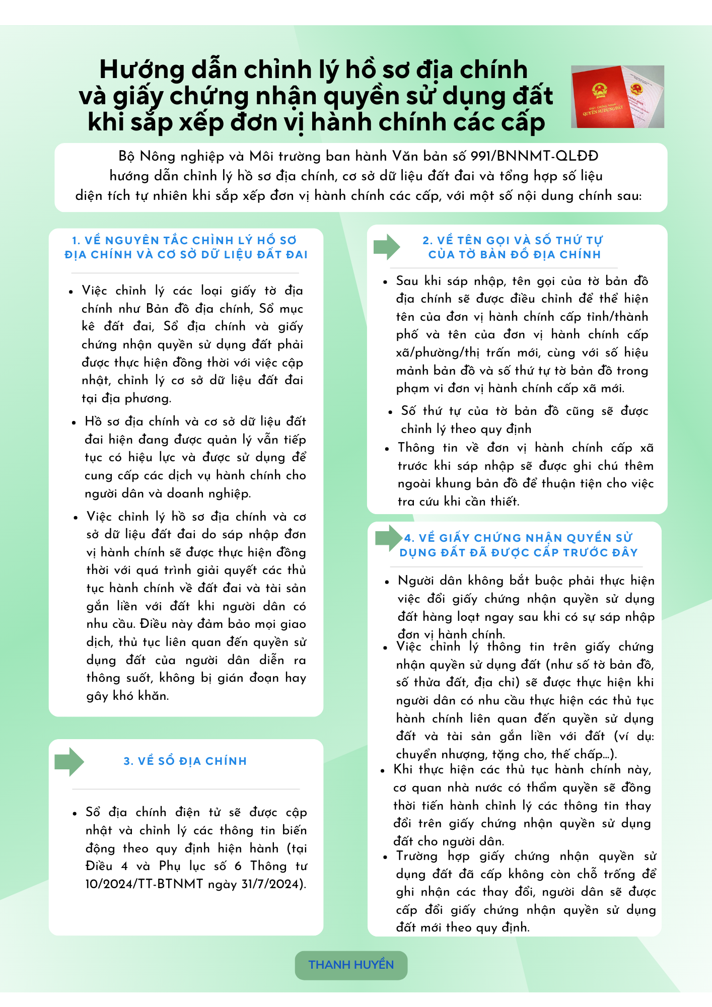 Bộ Nông nghiệp và Môi trường ban hành Văn bản hướng dẫn chỉnh lý hồ sơ địa chính, cơ sở dữ liệu đất đai và tổng hợp số liệu diện tích tự nhiên khi sắp xếp đơn vị hành chính các cấp, với một số nội dung chính sau: