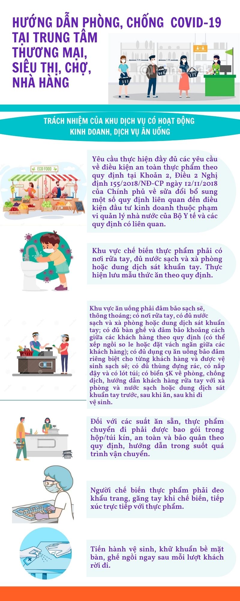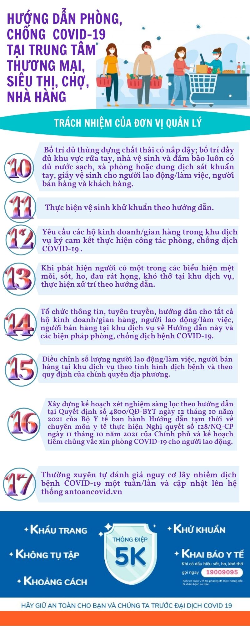 Nhằm thực hiện tốt chủ trương “mục tiêu kép”, vừa phát triển kinh tế xã – hội, vừa phòng, chống có hiệu quả dịch Covid-19. Ngày 07/12/2021, Bộ Y tế ban hành Hướng dẫn phòng, chống dịch Covid-19 tại trung tâm thương, mại, chợ, nhà hàng, siêu thị. Trong đó, nêu rõ trách nhiệm của đơn vị quản lý; của hộ kinh doanh, gian hàng trong khu dịch vụ; của người lao động, người làm việc, người bán hàng, khách hàng; của khu dịch vụ có hoạt động kinh doanh, dịch vụ ăn uống.