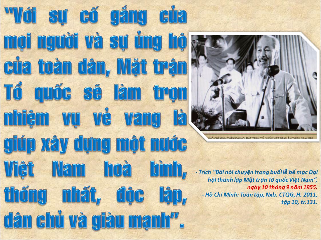 Năm 1955, thời điểm này cách mạng nước ta bước vào thời kỳ phát triển mới, miền Bắc đi lên xây dựng chủ nghĩa xã hội, miền Nam đấu tranh chống đế quốc Mỹ và chính quyền tay sai. Ngày 10 tháng 9 năm 1955, tại lễ bế mạc Đại hội thành lập Mặt trận Tổ quốc Việt Nam, trong bài nói chuyện Chủ tịch Hồ Chí Minh khẳng định sức mạnh của tinh thần đại đoàn kết, dù việc gì khó đến đâu, nhưng có sự đồng tâm hiệp lực, có sự đoàn kết trên dưới một lòng, đều có thể thực hiện được.