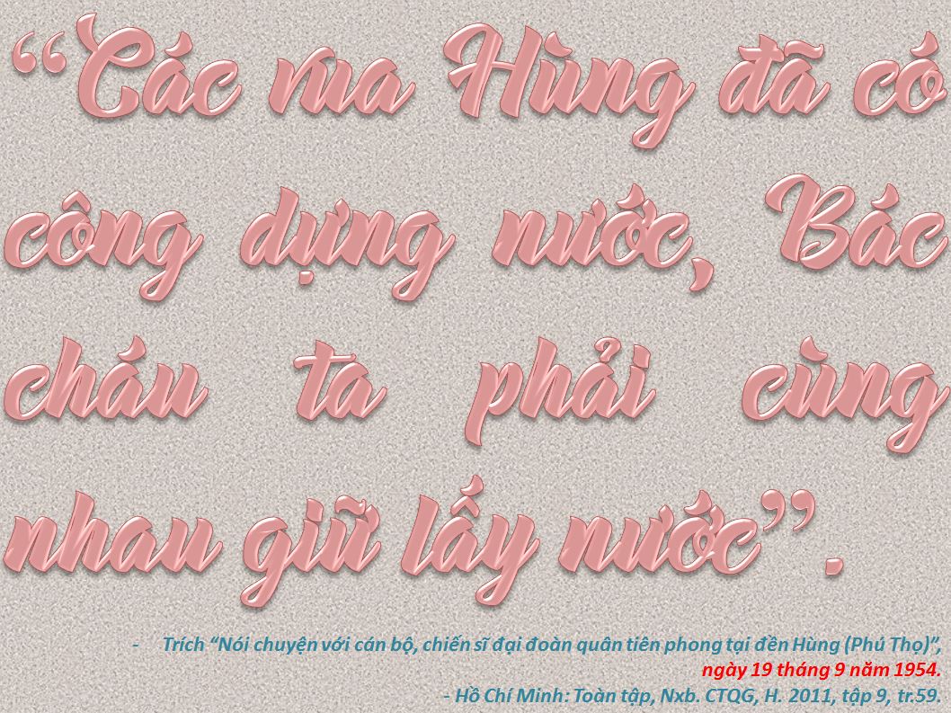 Bác Hồ kính yêu đã căn dặn: “Các vua Hùng đã có công dựng nước, Bác cháu ta phải cùng nhau giữ lấy nước”. Đó là mệnh lệnh thiêng liêng của đất nước và dân tộc mà tất cả các thế hệ người Việt Nam phải ra sức giữ gìn, xây dựng và phát triển để cho Tổ quốc Việt Nam ngày càng giàu đẹp và trường tồn.