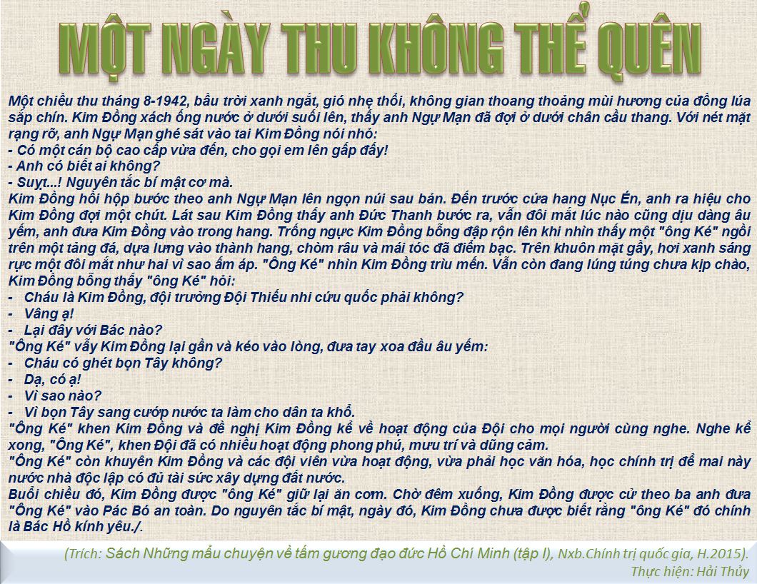 Học tập và làm theo lời Bác Hồ dạy, toàn Đảng, toàn dân, toàn quân tiếp tục phát huy truyền thống hào hùng của dân tôc, cùng nhau đoàn kết, quyết tâm bảo vệ vững chắc từng tấc đất của Tổ quốc, xây dựng đất nước ngày càng giàu mạnh, trường tồn.