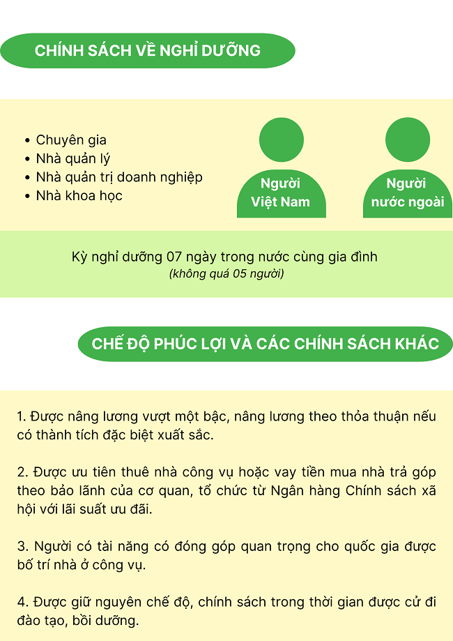 Ngày 31/12/2024, Chính phủ ban hành Nghị định 179/2024/NĐ-CP quy định chính sách thu hút, trọng dụng người có tài năng làm việc trong cơ quan, tổ chức, đơn vị của Đảng Cộng sản Việt Nam, Nhà nước, Mặt trận Tổ quốc Việt Nam và các tổ chức chính trị - xã hội, với một số chính sách trọng dụng người có tài năng tại điều 15, 16, 17, 18, 19 như sau:
