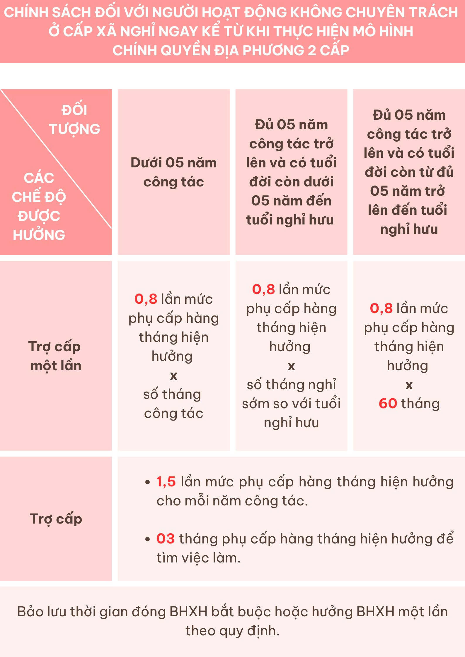 Ngày 15/6/2025, Chính phủ ban hành Nghị định số 154/2025/NĐ-CP quy định về tinh giản biên chế với chính sách thôi việc, chính sách đối với người hoạt động không chuyên trách ở cấp xã nghỉ ngay kể từ khi thực hiện mô hình chính quyền địa phương 2 cấp tại điều 8, 9 như sau: