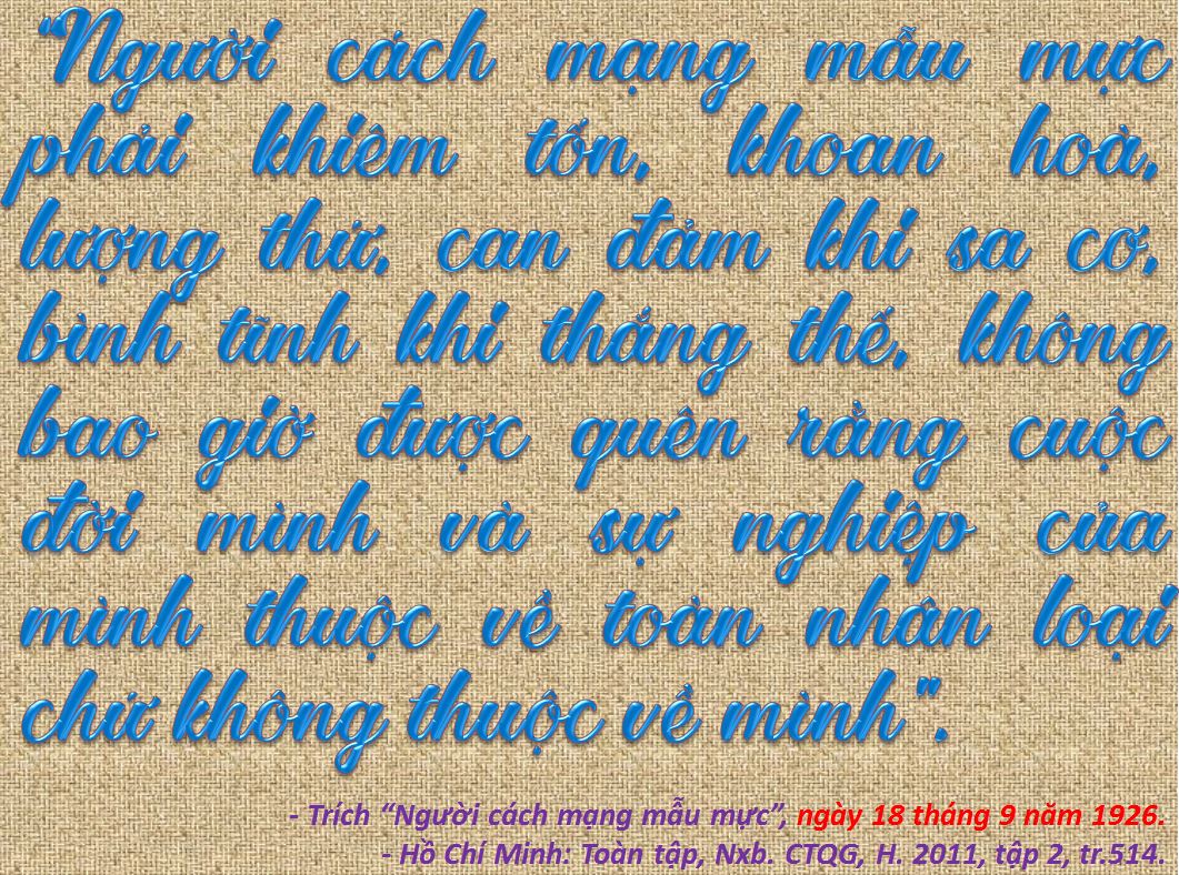 Ngày 18 tháng 9 năm 1926 Nguyễn Ái Quốc viết bài “Người cách mạng mẫu mực”, đăng trên báo Thanh Niên, số 61, năm 1926. Trong bài viết Bác nêu 12 điều đòi hỏi ở một người cách mạng, trong đó khẳng định: