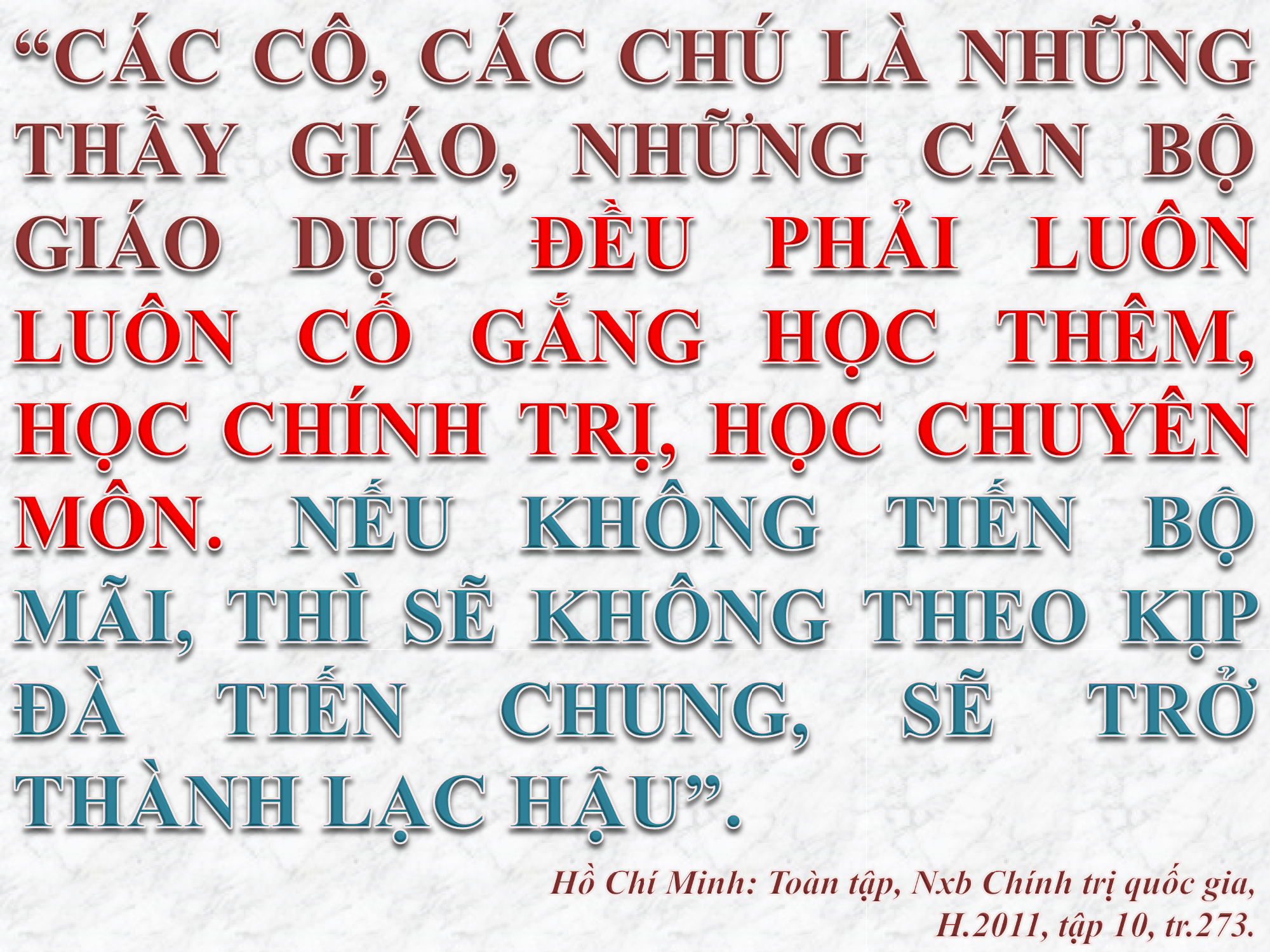Trong những năm qua, thực hiện lời dạy của Bác, đội ngũ giáo viên và cán bộ ngành giáo dục Tuyên Quang luôn nêu cao tinh thần trách nhiệm, ra sức phấn đấu học tập, nghiên cứu, tiếp thu cái mới, ra sức rèn luyện, trau dồi phẩm chất đạo đức cách mạng, nâng cao trình độ chính trị, năng lực chuyên môn nghiệp vụ để phục vụ cho sự nghiệp giáo dục, góp sức xây dựng và bảo vệ Tổ quốc trong tình hình mới, xây dựng quê hương Tuyên Quang ngày một giàu đẹp, văn minh.