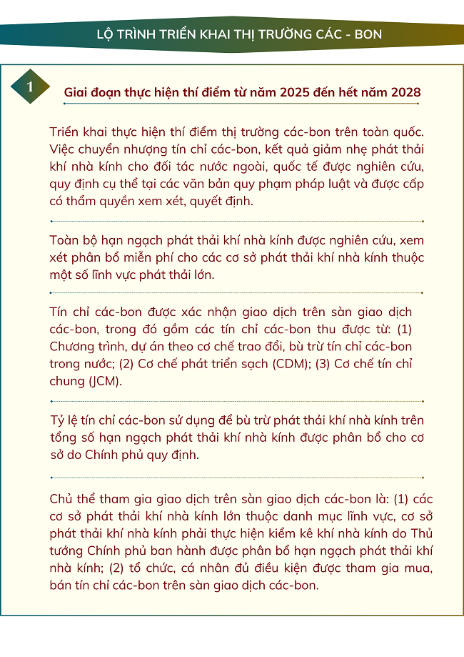 Ngày 24/01/2025, Thủ tướng Chính phủ ban hành Quyết định số 232/QĐ-TTg về phê duyệt Đề án thành lập và phát triển thị trường các-bon tại Việt Nam, với quan điểm, nguyên tắc, mục tiêu, lộ trình như sau: