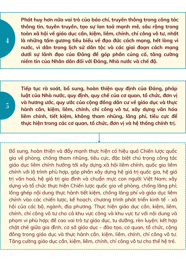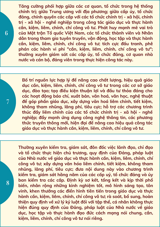 Ngày 16/01/2025, Bộ Chính trị ban hành Chỉ thị số 42-CT/TW về tăng cường sự lãnh đạo của Đảng đối với công tác giáo dục cần, kiệm, liêm, chính, chí công vô tư, với một số nhiệm vụ và giải pháp trọng tâm sau: