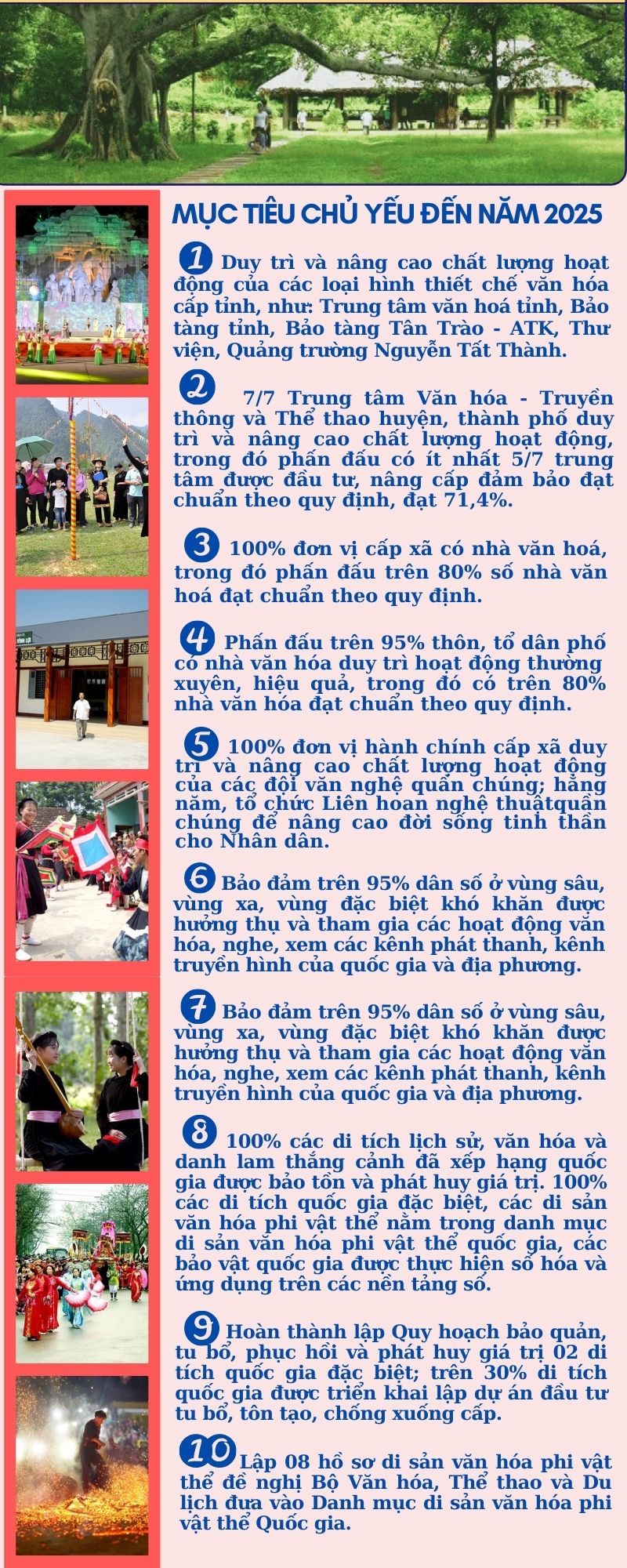 Thực hiện Quyết định số 1090/QĐ-TTg ngày 12/11/2021 của Thủ tướng Chính phủ về việc phê duyệt Chiến lược phát triển văn hoá Việt Nam đến năm 2030; ngày 27/4/2022, Uỷ ban nhân dân tỉnh đã ban hành Kế hoạch số 70/KH-UBND thực hiện Chiến lược phát triển Văn hoá đến năm 2030 trên địa bàn tỉnh, trong đó đề ra các mục tiêu, nhiệm vụ và giải pháp để thực hiện.