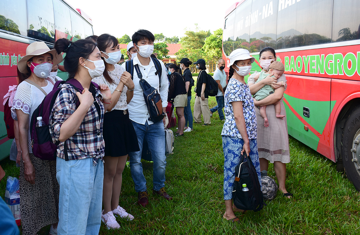Các công dân chuẩn bị lên xe về địa phương sau khi hoàn thành cách ly 14 ngày.