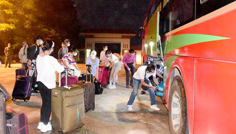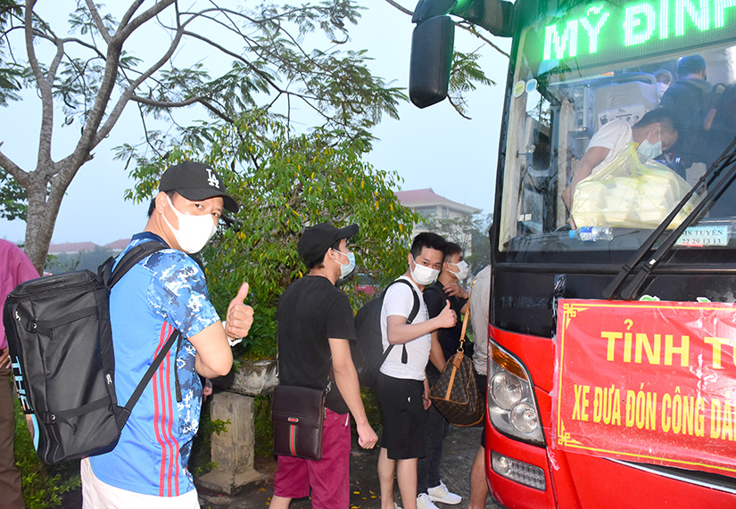 Các công dân lên xe về địa phương sau khi hoàn thành cách ly 14 ngày.