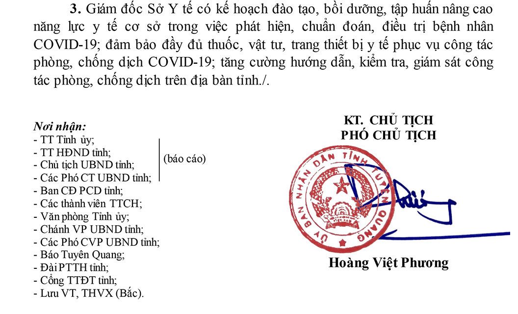Ngày 21/11/2021, Uỷ ban nhân dân tỉnh Tuyên Quang đã ban hành Công điện về việc tăng cường quản lý địa bàn và thực hiện hiệu quả các biện pháp phòng, chống dịch Covid-19.