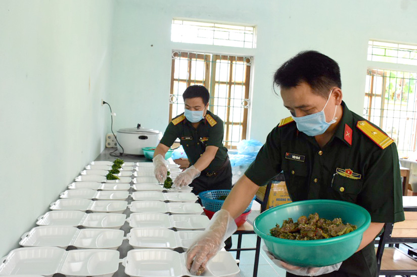 Các chiến sỹ khu cách ly tập trung chuẩn bị bữa cơm cho các công dân thực hiện cách ly tại khu cách ly tập trung huyện Chiêm Hóa.