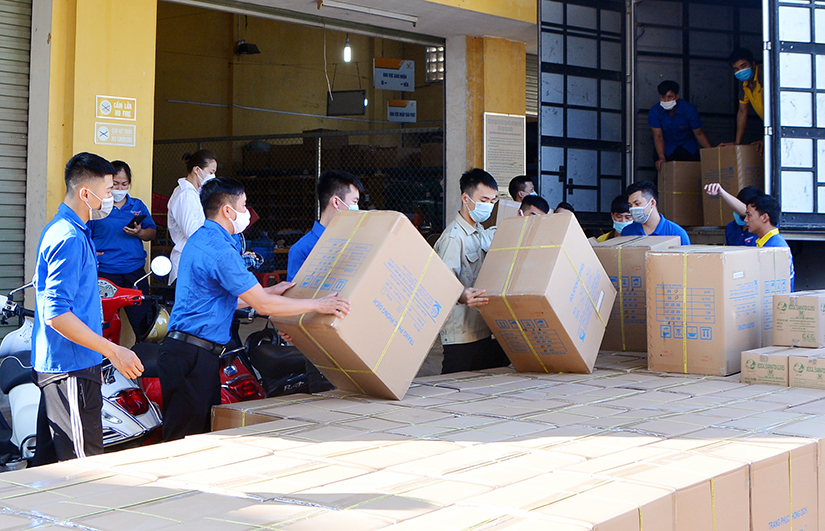 Đoàn viên, thanh niên bốc xếp vật tư y tế gửi hỗ trợ các tỉnh phía Nam.