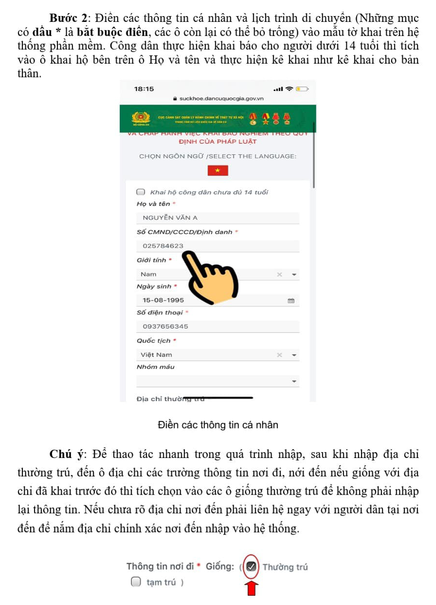 Để tạo điều kiện thuận lợi cho công dân khai báo y tế nhanh khi qua các chốt kiểm soát phòng, chống dịch Covid-19 và quản lý chặt chẽ công dân đi, về địa phương, phục vụ tốt cho công tác quản lý công dân, truy vết khi có yếu tố dịch tễ, Công an tỉnh, Sở Thông tin và Truyền thông hướng dẫn công dân khai báo qua ứng dụng phần mềm khai báo y tế trên nền tảng cơ sở dữ liệu dân cư.