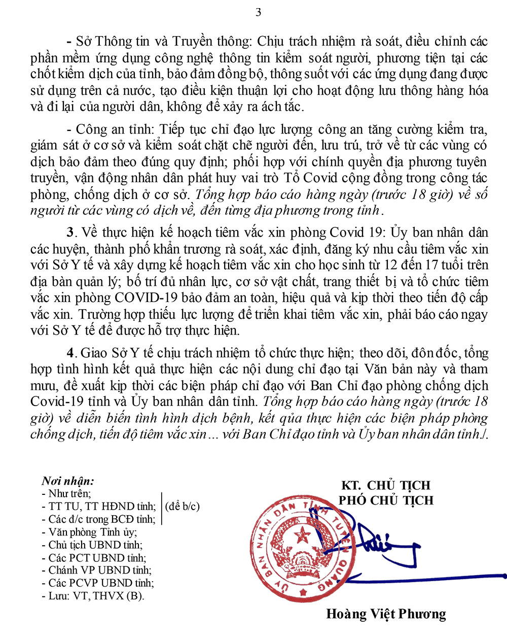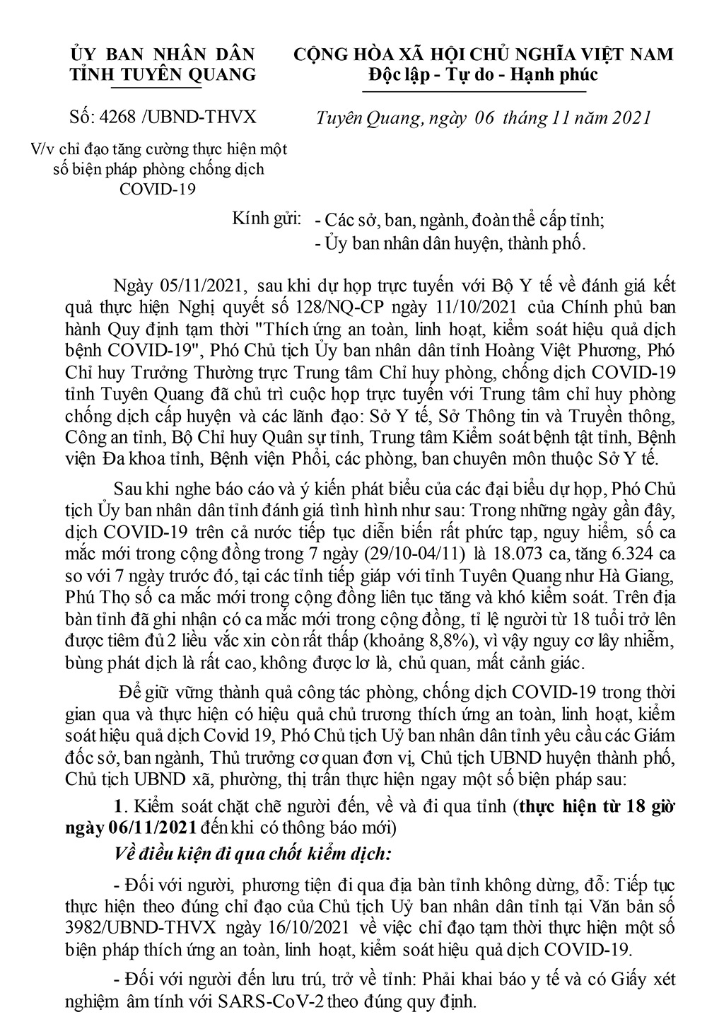 UBND tỉnh vừa ban hành văn bản số 4268/UBND-THVX ngày 6-11-2021 về chỉ đạo tăng cường thực hiện một số biện pháp phòng chống dịch Covid-19.