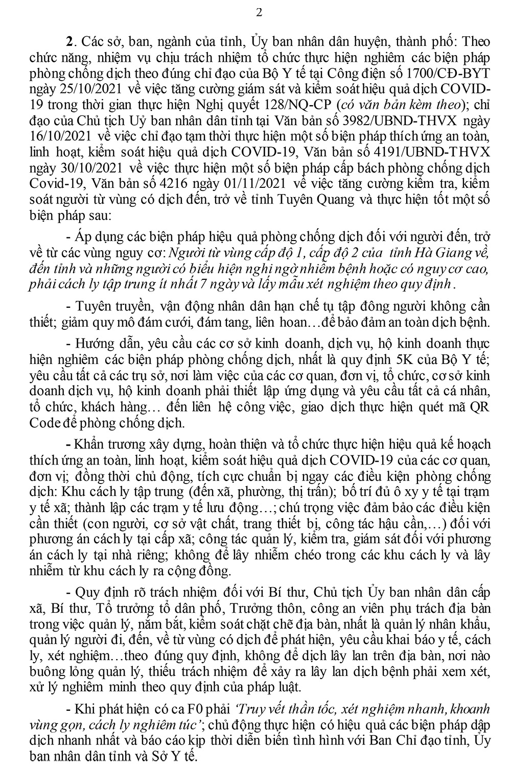 Đối vời người từ vùng cấp độ 1, cấp độ 2 của tỉnh Hà Giang về, đến tỉnh và những người có biểu hiện nghi ngờ nhiễm bệnh hoặc có nguy cơ cao, phải cách ly tập trung ít nhất 7 ngày và lấy mẫu xét nghiệm theo quy định.
