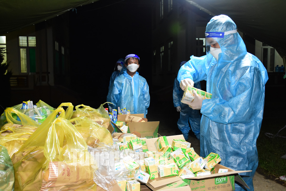 Lực lượng làm nhiệm vụ tại khu cách ly chuẩn bị những nhu yếu phẩm cho các công dân.