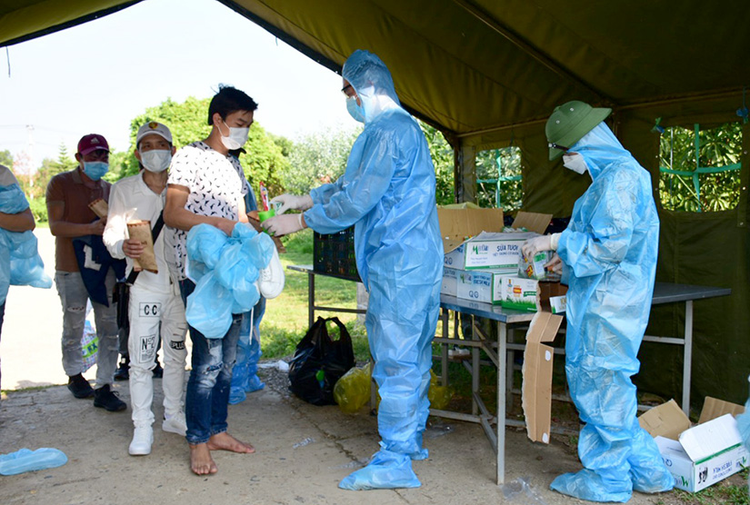Lực lượng làm nhiệm vụ tại khu cách ly phát đồ dùng cá nhân cho các công dân trước khi về phòng.