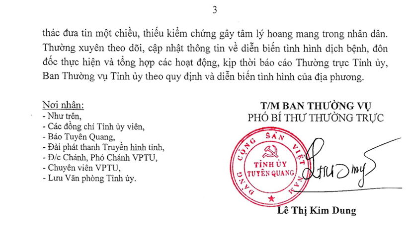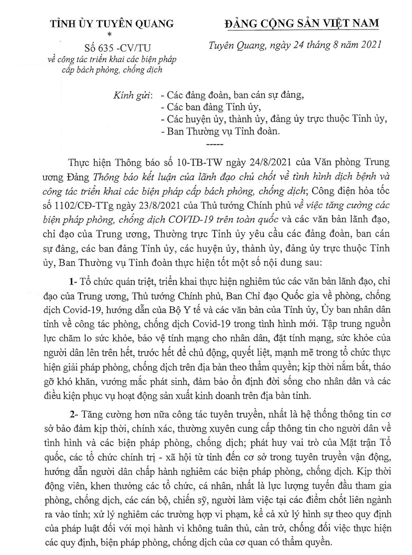 Ngày 24/8/2021, Thường trực Tỉnh ủy có văn bản số 635 -CV/TU về công tác triển khai các biện pháp cấp bách phòng, chống dịch. Theo đó, UBND tỉnh yêu cầu các đảng đoàn, ban cán sự đảng, các ban đảng Tỉnh ủy, các huyện ủy, thành ủy, đảng ủy trực thuộc Tỉnh ủy, Ban Thường vụ Tỉnh đoàn thực hiện tốt một số nội dung: