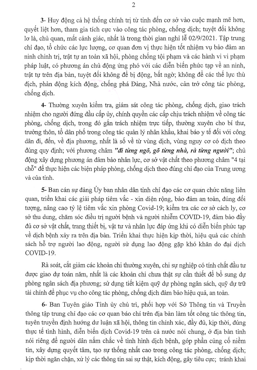 Quán triệt, triển khai thực hiện nghiêm túc các văn bản lãnh đạo, chỉ đạo về công tác phòng, chống dịch Covid-19 trong tình hình mới; tăng cường tuyên truyền về tình hình và các biện pháp phòng, chống dịch; xử lý nghiêm các trường hợp vi phạm, kể cả xử lý hình sự; tuyệt đối không lơ là, chủ quan, mất cảnh giác, nhất là trong thời gian nghi lễ 2-9-2021; giao trách nhiệm cho người đứng đầu cấp ủy, chính quyền các cấp chịu trách nhiệm về công tác phòng, chống dịch…; chủ động xây dựng phương án đảm bảo nhân lực, cơ sở vật chất theo phương châm "4 tại chỗ" để thực hiện các biện pháp phòng, chống dịch theo đúng chỉ đạo của Trung ương và của tỉnh...