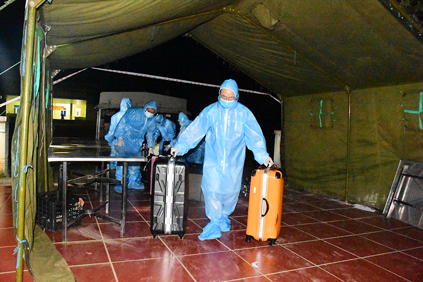 Lực lượng làm việc tại khu cách ly phát đồ dùng cá nhân cho các công dân.